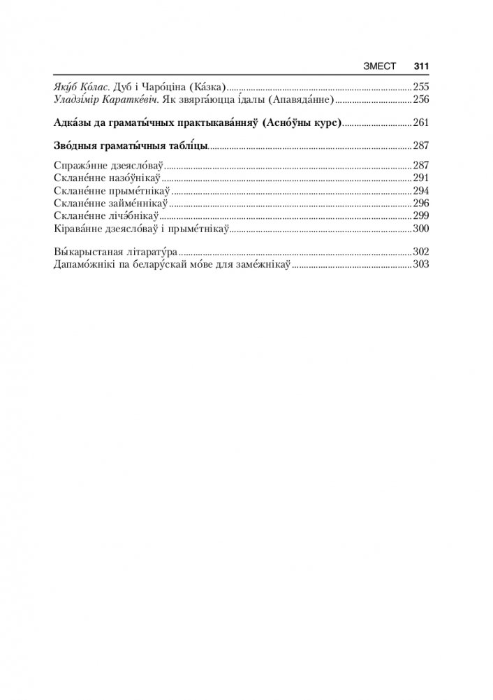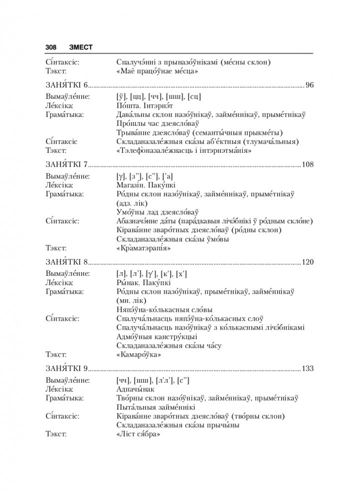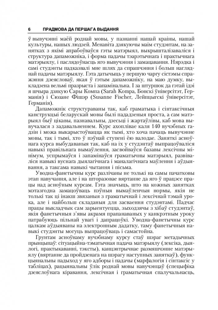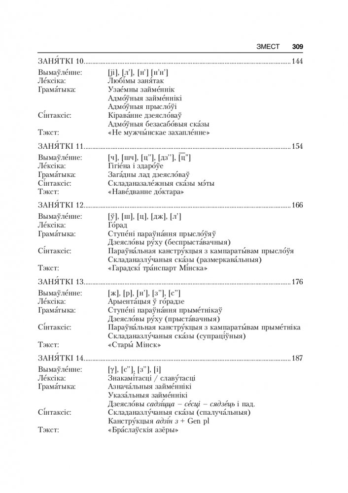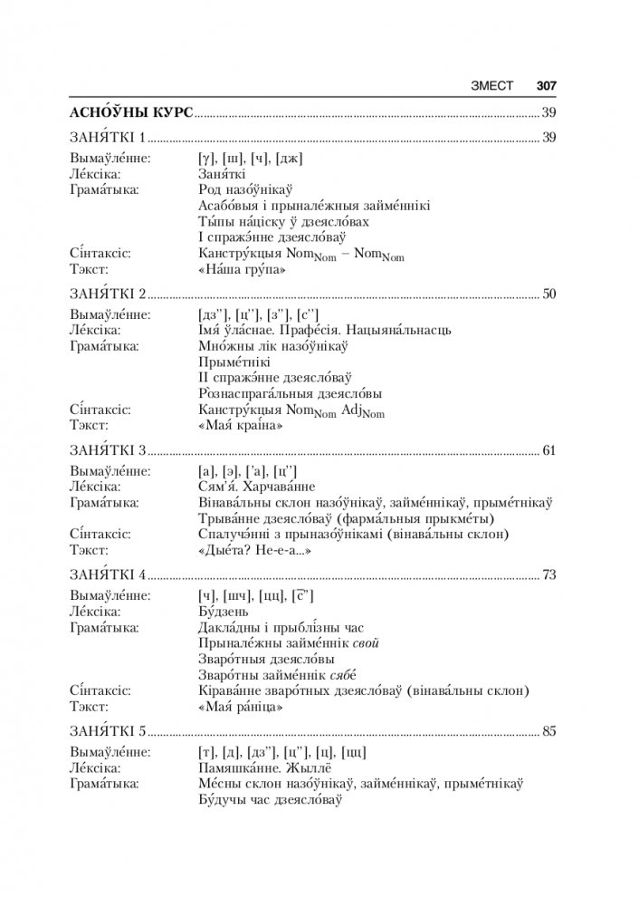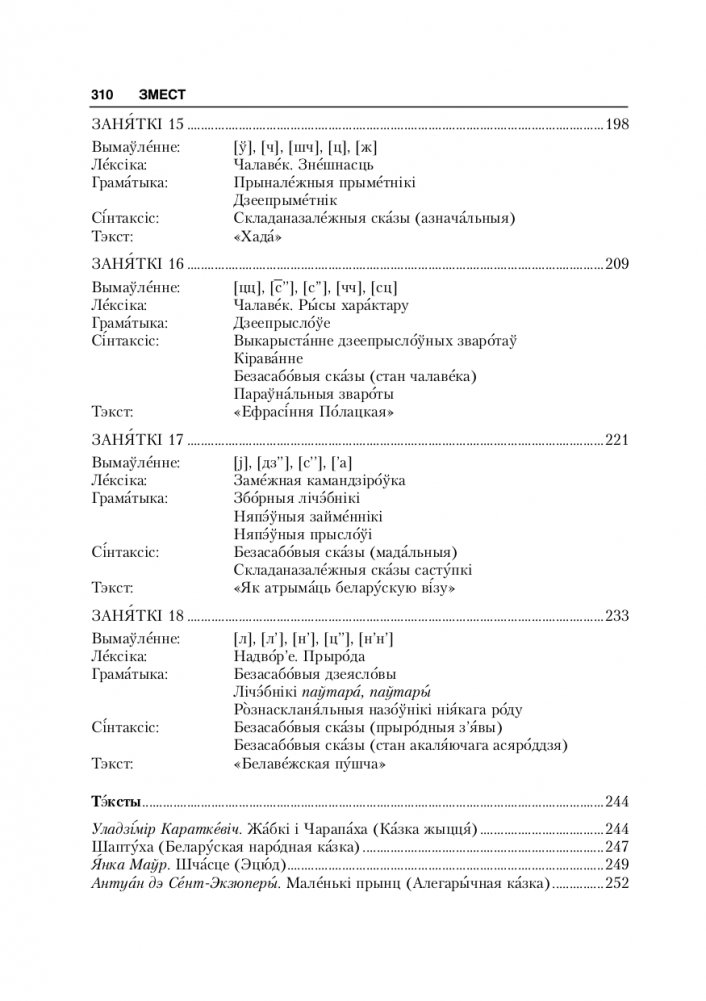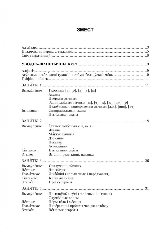 Дапаможнік складаюць уводна-фанетычны курс, асноўны курс, розныя тыпы мастацкіх тэкстаў (з лексiчнымi каментарыямі) для самастойнага чытання, адказы для граматычных практыкаванняў, зводныя граматычныя табліцы. У аснову заняткаў пакладзены тэматычны прынцып адбору лексікі, таблічны прынцып выкладу граматычных звестак, камунікацыйны прынцып выканання трэніровачных практыкаванняў. Электронны дадатак змяшчае фанетычны курс, дыялогі і тэксты. Для замежных студэнтаў устаноў вышэйшай адукацыi і ўсіх тых, хто хоча авалодаць беларускай мовай.