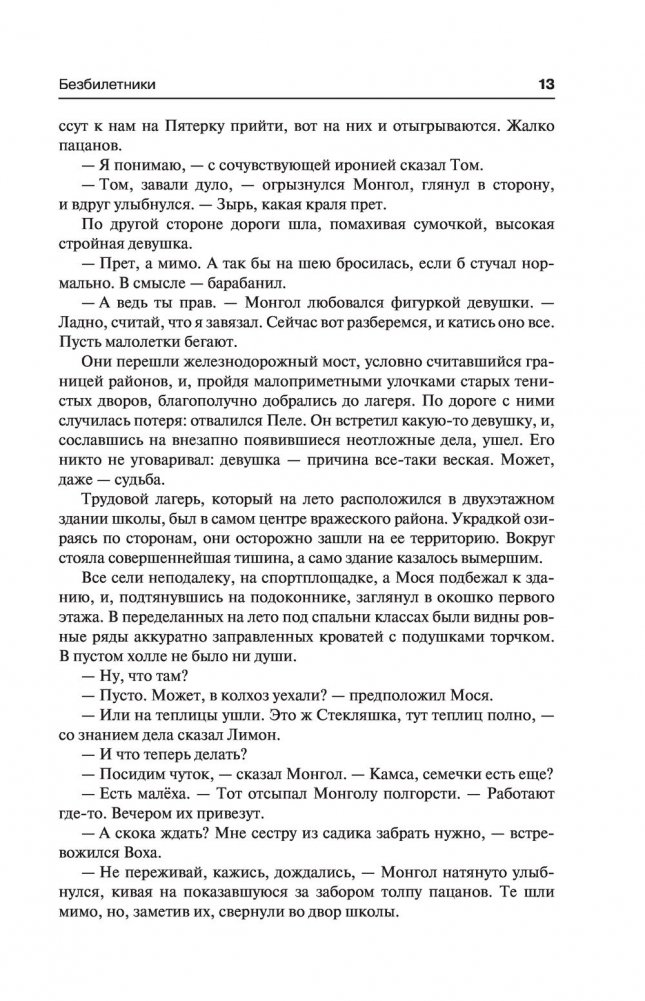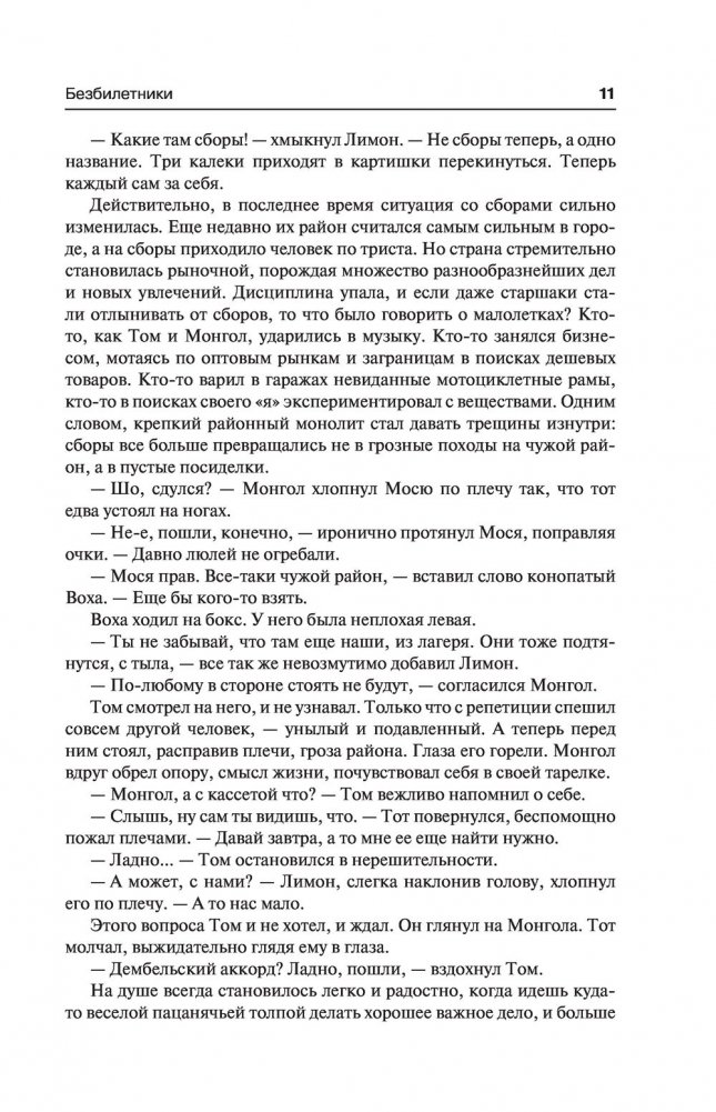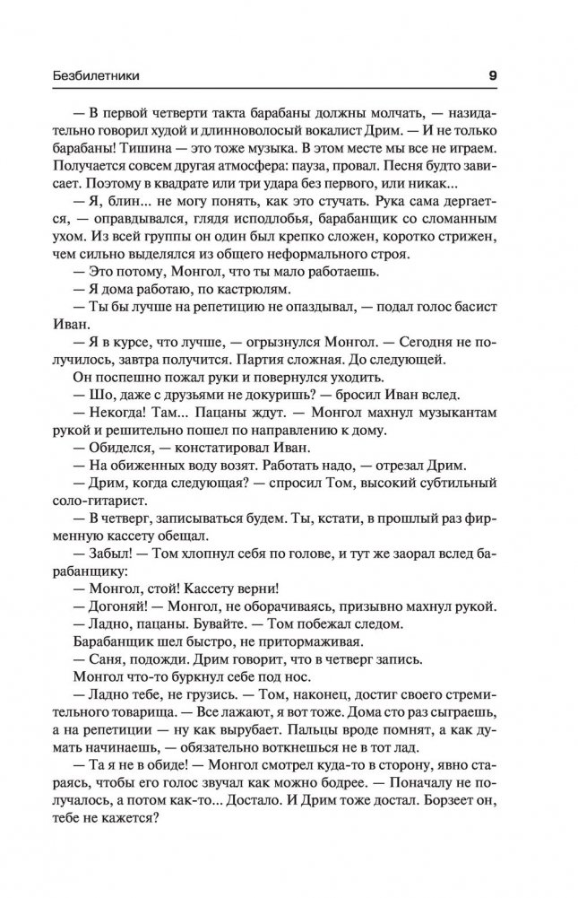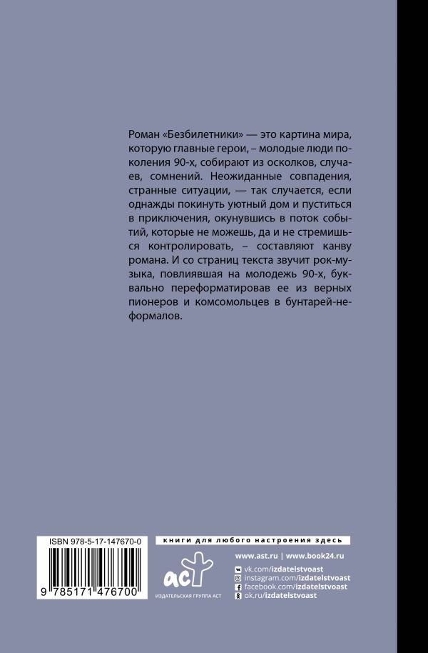 Роман "Безбилетники" — это картина мира, которую главные герои, – молодые люди поколения 90-х, собирают из осколков, случаев, сомнений. Неожиданные совпадения, странные ситуации, — так случается, если однажды покинуть уютный дом и пуститься в приключения, окунувшись в поток событий, которые не можешь, да и не стремишься контролировать, – составляют канву романа. И со страниц текста звучит рок-музыка, повлиявшая на молодежь 90-х, буквально переформатировав ее из верных пионеров и комсомольцев в бунтарей-неформалов.