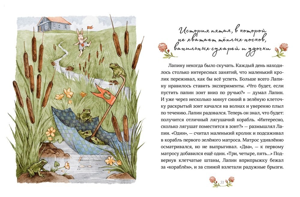 Лапин – маленький кролик, которому не сидится на месте. Он должен научить хомяка слушать, как в ушах свистит ветер, покормить подкроватное чудовище морковными пастилками и срочно что-то изобрести. Папа Лапин пишет стихи, а мама знает, где найти радость. А еще у Лапина есть дядюшка-фокусник и Простодедушка-путешественник (кстати, он его сам нашел). Лапина невозможно не любить, ведь он совершенно такой же, как и любой ребенок.