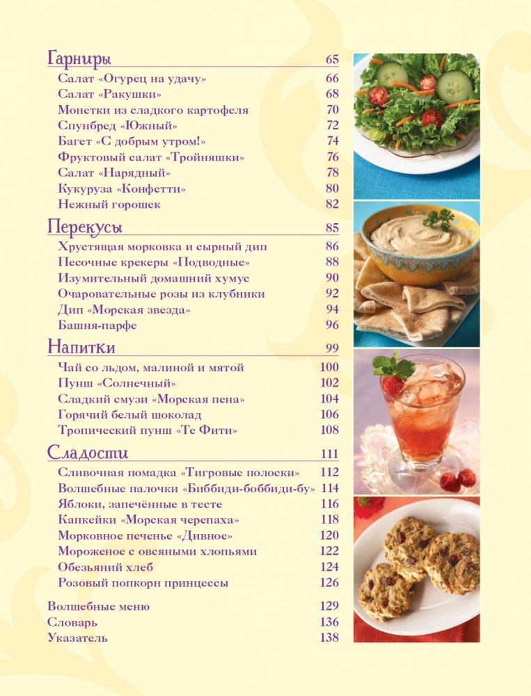 • 50 простых (на самом деле простых!) рецептов, с которыми справится даже начинающий кулинар, например, песочные косички с сыром и ветчиной от Рапунцель, «морской» салат от Ариэль или «тигровая» помадка от Жасмин.