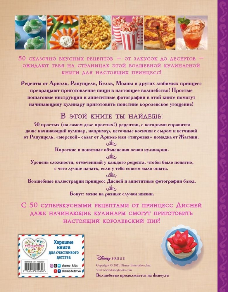 Рецепты от Ариэль, Рапунцель, Белль, Моаны и других любимых принцесс превращают приготовление пищи в настоящее волшебство! Простые пошаговые инструкции и аппетитные фотографии в этой книге помогут начинающему кулинару приготовить поистине королевское угощение!