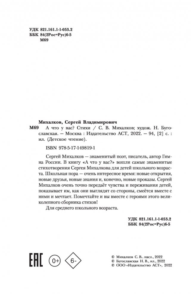 Сергей Михалков — знаменитый поэт, писатель, автор Гимна России. В книгу «А что у вас?» вошли самые знаменитые стихотворения Сергея Михалкова для детей школьного возраста. Школьная пора — очень интересное время: новые открытия, новые друзья, новые знания и, конечно, новые проказы. Сергей Михалков очень точно передаёт чувства и переживания детей, показывает им, как они выглядят со стороны, смеётся вместе с ними и мечтает. Помечтайте и вы вместе с героями этого великолепного сборника стихов!
