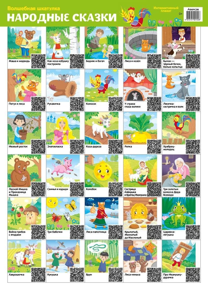 Современный путь к сказке для современных детей. Интерактивный плакат включает 30 красочных иллюстраций с QR-кодами, по которым ребенок без труда выберет и прослушает аудиоверсии 30 народных сказок. Сказки рекомендованы учебной программой дошкольного образования и озвучены профессиональными актерами.