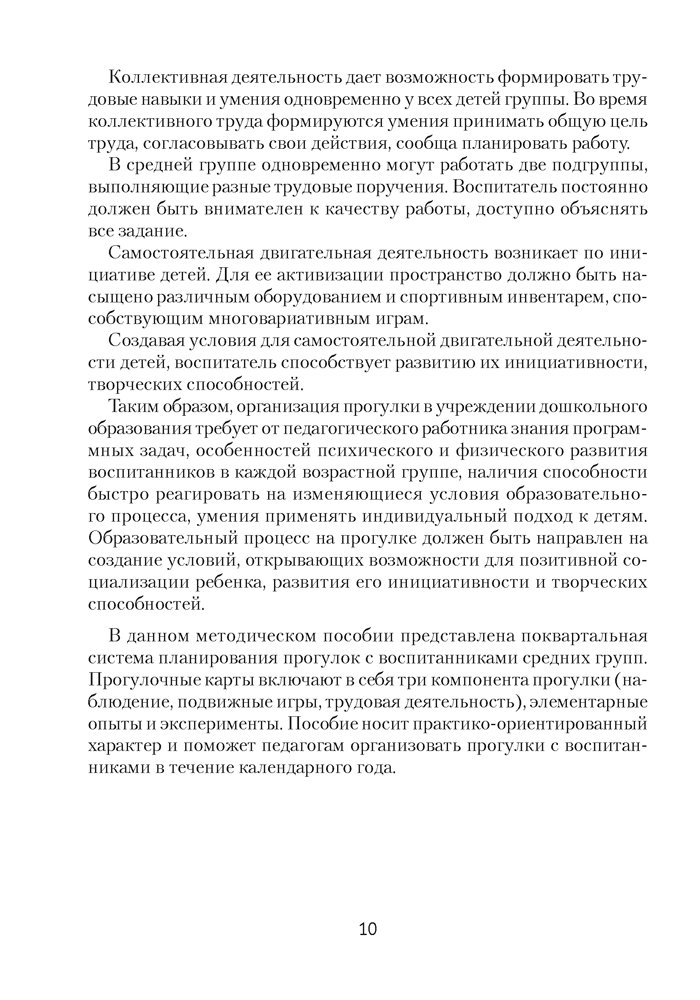 Пособие раскрывает суть, значение и структуру прогулки в дошкольном учреждении, включает методические рекомендации для педагогов и поквартальную систему планирования прогулки в средней группе.