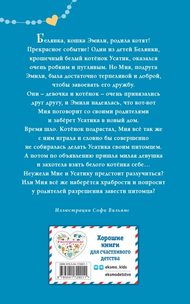 Легко ли быть отважным? Вот девочка Мия никак не могла отважиться и попросить родителей взять домой котёнка. Дело в том, что у их знакомых кошка родила котят, и Мия очень подружилась с одним из них, ласковым белоснежным Усатиком. Но пока Мия думала и боялась, Усатика взяла другая девушка… Что же теперь делать Мие? Как ей вернуть своего друга?