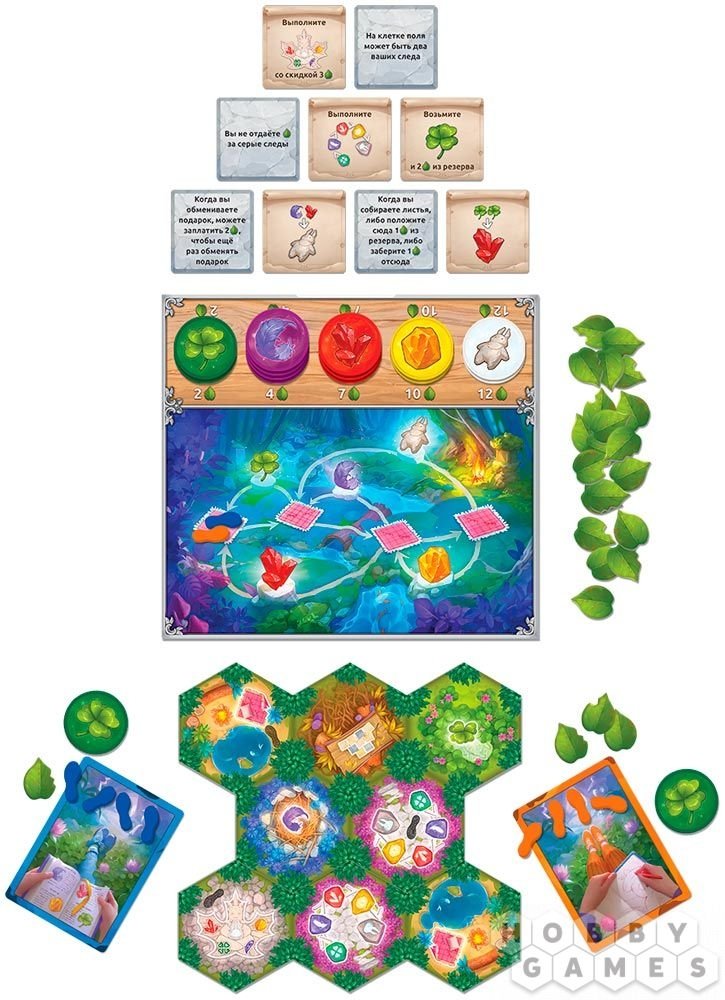 По ходу игры путешественникам предстоит перемещаться по модульному полю и оставлять свои следы на его клетках. На некоторых клетках вы сможете пообщаться с духами и задобрить их, чтобы получить от них подарок. Посещайте разные уголки леса: поляну, озеро, замшелую каменную плиту... Каждый ход вы сможете передвинуться и сделать действие. Двигаться можно только на клетку, на которой ещё нет ваших следов и которая располагается по соседству с клетками, где ваши следы есть (это правило не касается первого хода, сначала свой след можно поставить на любую клетку). После движения вы можете выполнить действие клетки, заплатив листьями за чужие следы на ней, или собрать листья (взять два листка из резерва).