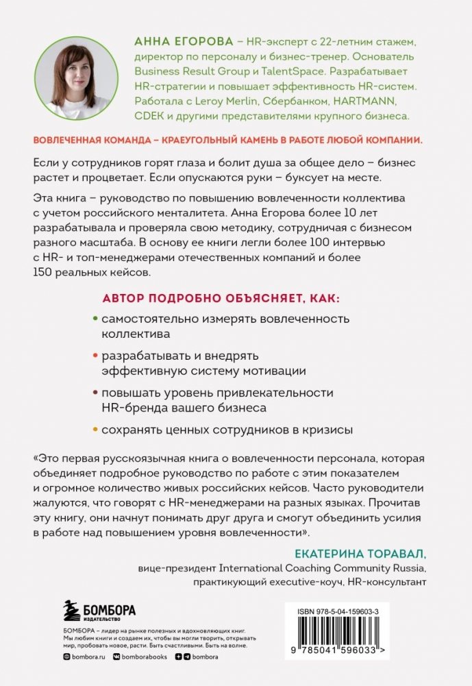 Эта книга — руководство по повышению вовлеченности коллектива с учетом российского менталитета. Автор, HR-эксперт Анна Егорова, более 10 лет разрабатывала и проверяла свою методику, сотрудничая с бизнесом разного масштаба. В основу ее книги легло более 100 интервью с HR- и топ-менеджерами отечественных компаний и более 150 реальных кейсов.