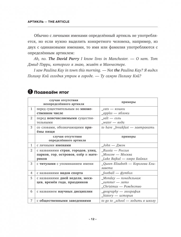 Издание охватывает полный объем грамматики английского языка, необходимый для уровней A1–B1. Здесь подробно рассмотрены такие темы, как времена английских глаголов, модальные глаголы, употребление предлогов, артиклей и местоимений, а также построение вопросов и условных предложений. Наглядные схемы помогут вам разобраться во всех нюансах грамматики английского языка. После каждой главы даются упражнения, выполнение которых поможет проработать и применить на практике теоретический материал. В конце книги вы найдете полезные приложения и ключи к упражнениям.