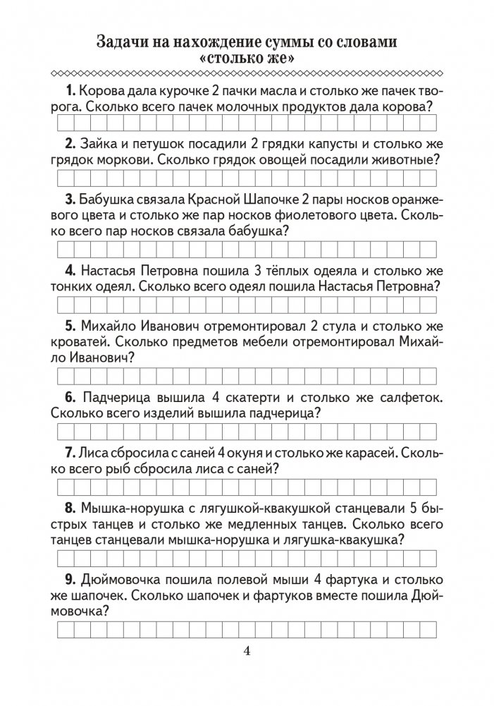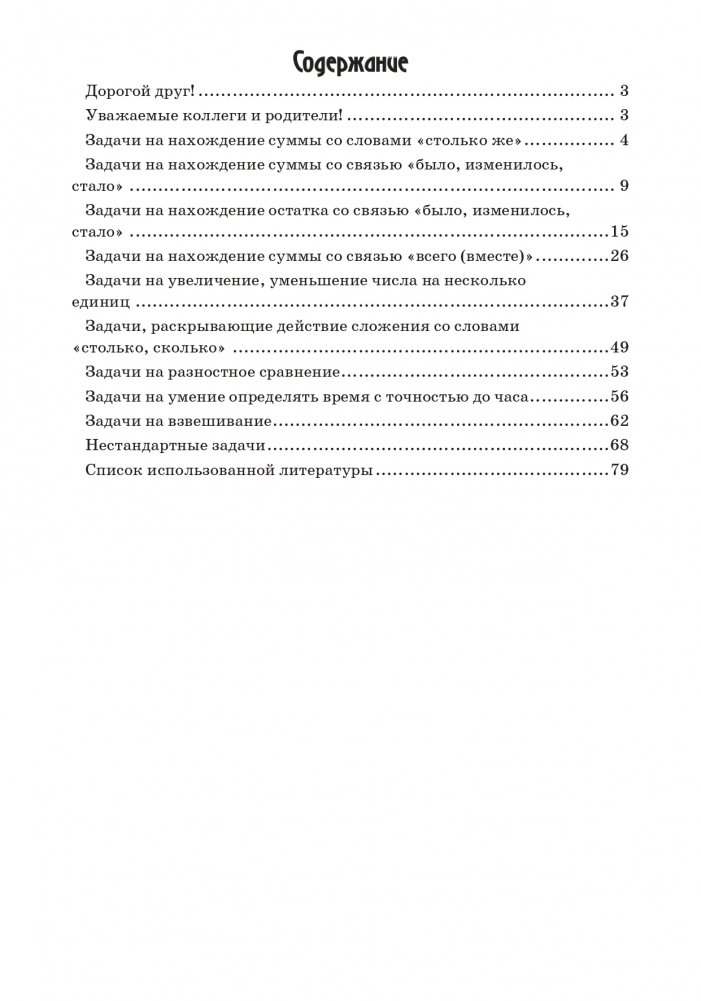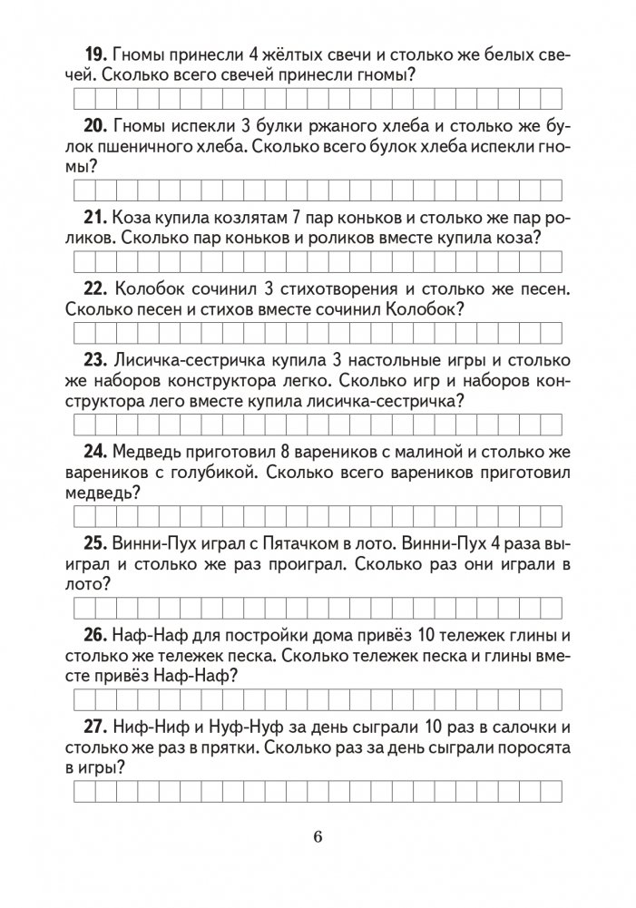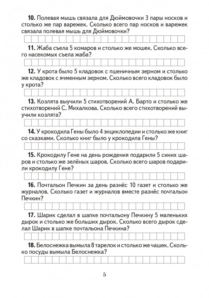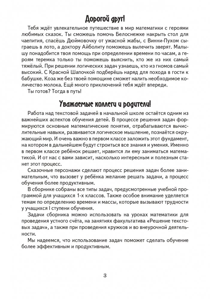 Сборник содержит основные типы задач, предусмотренные учебной программой для учащихся 1-х классов. Материал пособия направлен на отработку навыков решения типовых текстовых задач, в качестве дополнительных заданий для учащихся. Издание может быть использовано для проведения факультативных и кружковых занятий.