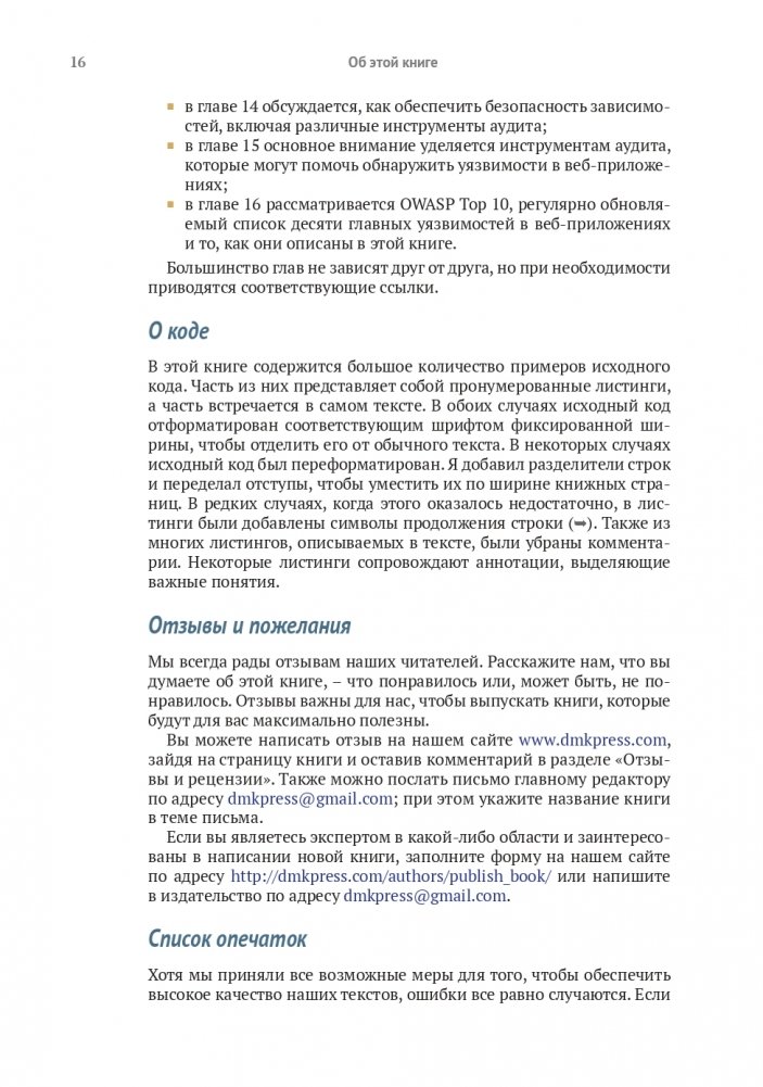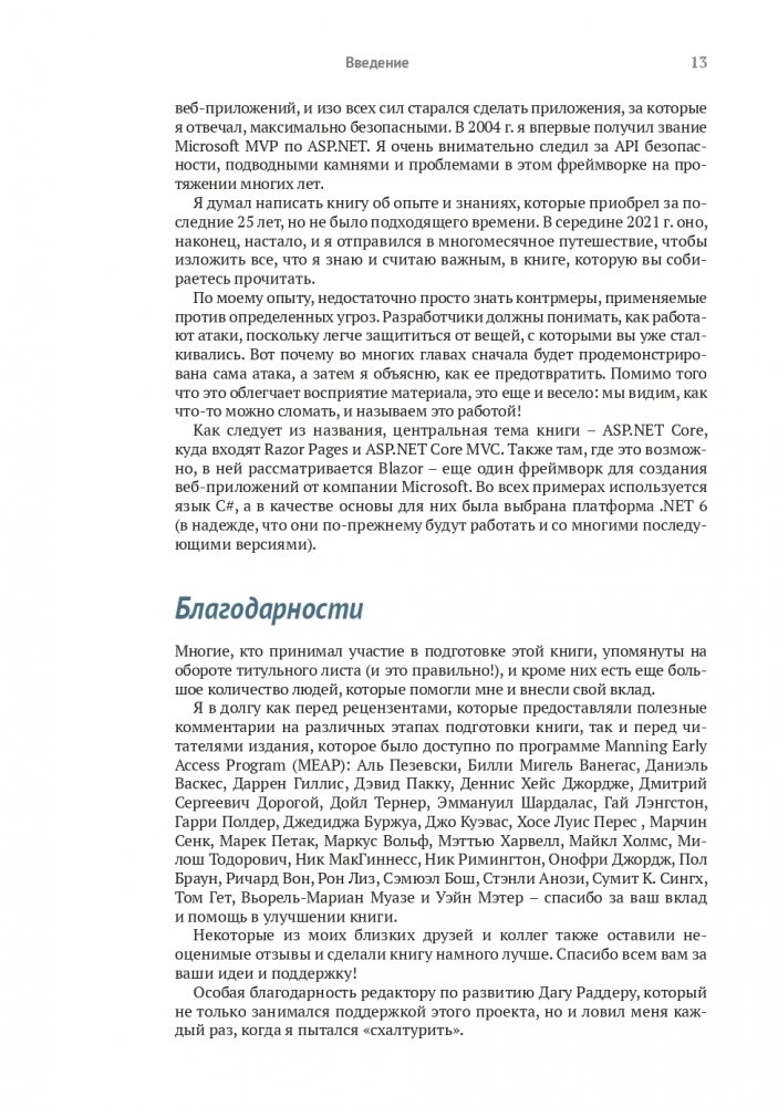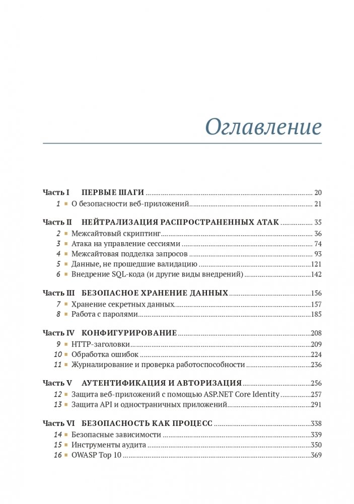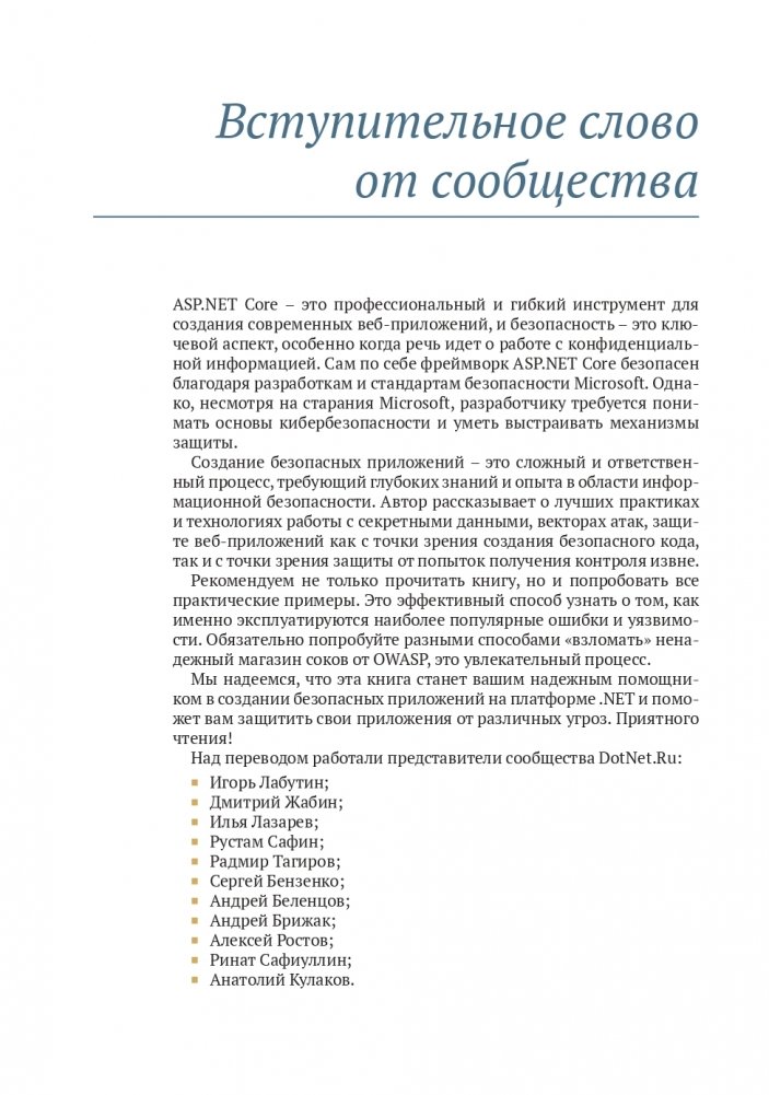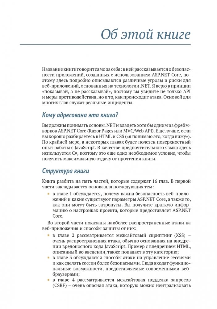 Приложения ASP.NET Core подвержены риску атак. Существуют конкретные меры, которые помогут избежать взлома. В книге показаны такие методы защиты веб-приложений ASP.NET Core, как безопасное взаимодействие с браузером, распознавание и предотвращение распространенных угроз, развертывание уникальных API безопасности этого фреймворка. Приводятся способы написания безопасного кода и примеры с аннотациями, а также полное описание встроенных инструментов безопасности ASP.NET Core. Рассматриваются реальные нарушения в системе безопасности, включая мошеннические расширения Firefox и кражу паролей в Adobe.