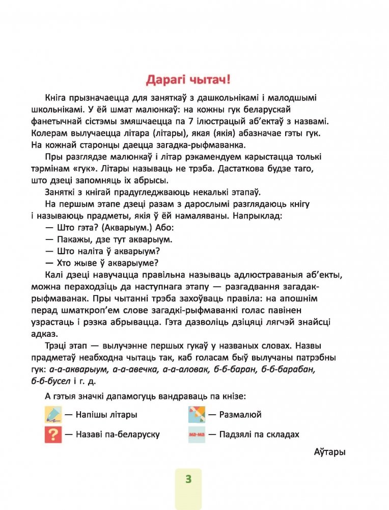 У кнізе чытач знойдзе шмат малюнкаў розных аб'ектаў з назвамі на кожны гук беларускай фанетычнай сістэмы. Азбука дапаможа пашырыць слоўнікавы запас дзіцяці, навучыць вылучаць гукі і склады ў словах, разаўе маўленне, памяць і мысленне.