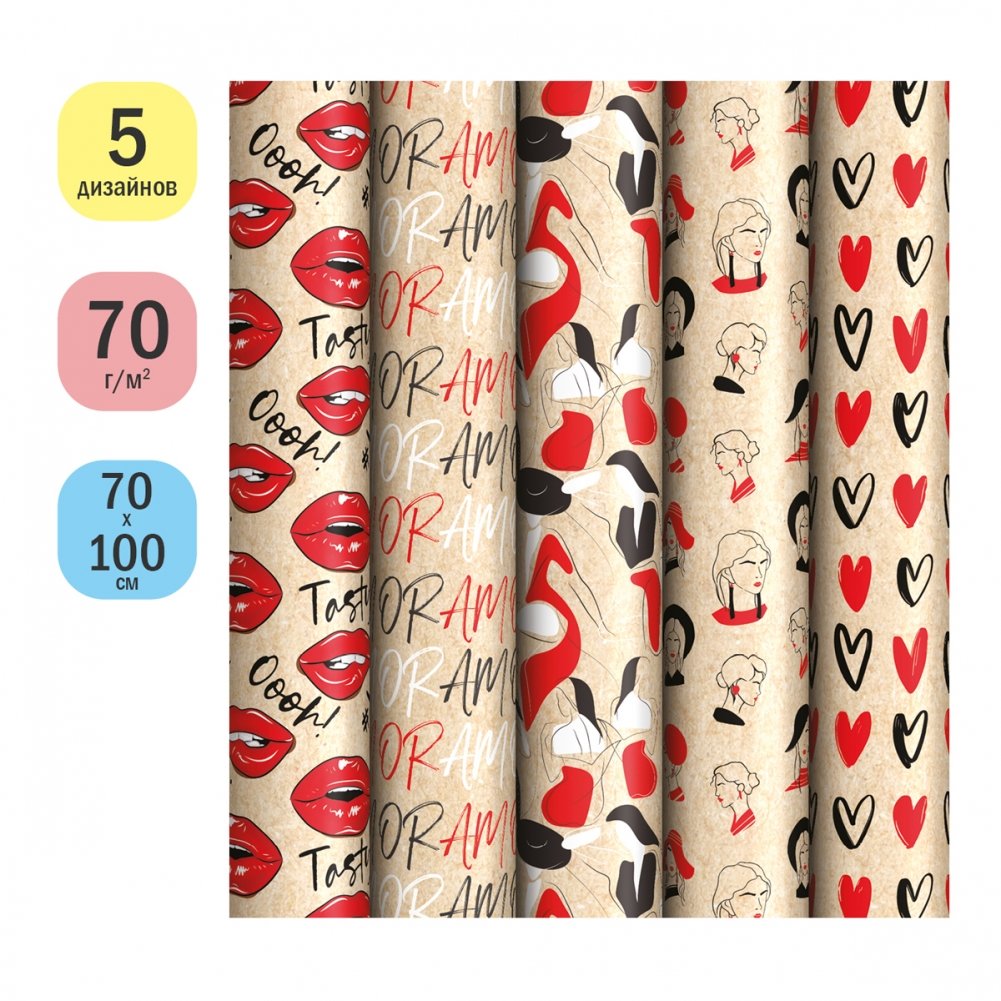 Упаковочная бумага крафт 70*100 см, ArtSpace "Женский стиль", 70 г/м2, ассорти 5 дизайнов. Арт. К100_46611