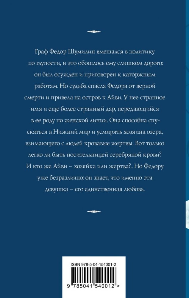 Граф Федор Шумилин вмешался в политику по глупости, и это обошлось ему слишком дорого: он был осужден и приговорен к каторжным работам. Но судьба спасла Федора от верной смерти и привела на остров к Айви. У нее странное имя и еще более странный дар, передающийся в ее роду по женской линии. Она способна спускаться в Нижний мир и усмирять хозяина озера, взимающего с людей кровавые жертвы. Вот только легко ли быть носительницей серебряной крови? И кто же Айви — хозяйка или жертва?.. Но Федору уже безразлично: он знает, что именно эта девушка — его единственная любовь.