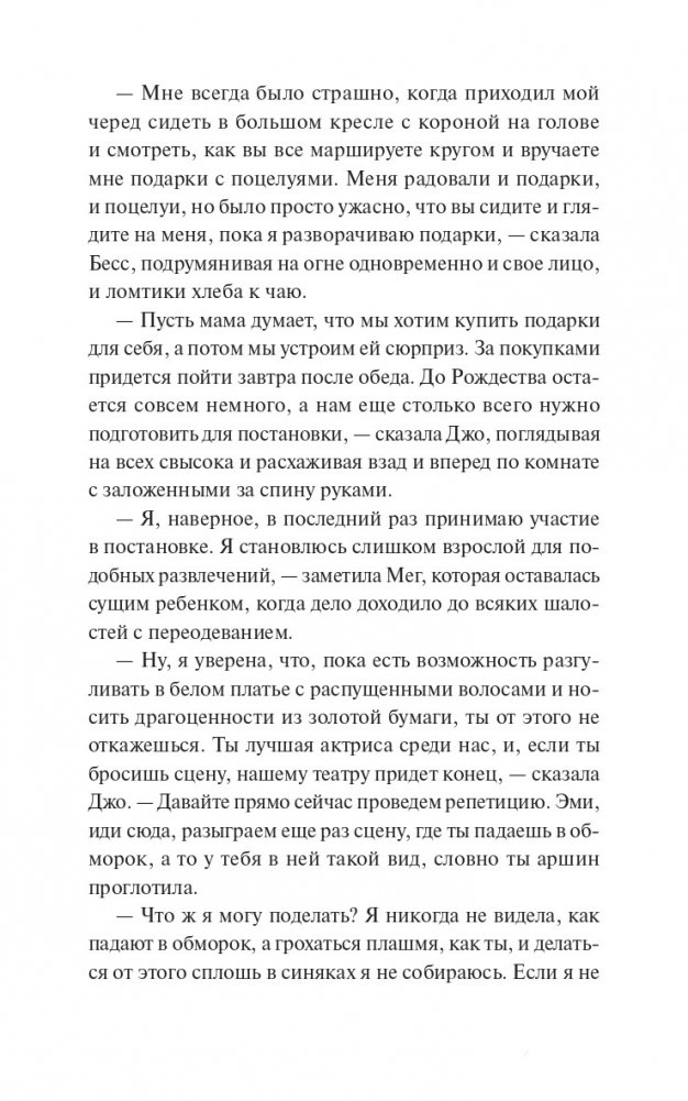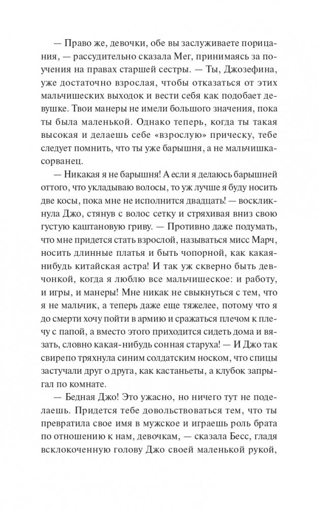 "Маленькие женщины" — ставший классическим роман американской писательницы Луизы Мэй Олкотт о четырех сестрах Марч, которые вместе переживают нелегкие времена. Обратившись к воспоминаниям детства, писательница, выросшая в дружной, но небогатой семье, показывает читателю жизнь таких разных и все же близких друг другу девушек — Мег, Джо, Бесс и Эми. Каждая из них идет своим путем, но и в радостях, и в ссорах не забывает о том, что по-настоящему важно: о семье, любви и дружбе. "Как было бы здорово, если бы все воздушные замки, которые мы строим в мечтах, могли стать настоящими и в них можно было бы жить". Для кого эта книга: Для читателей классической литературы. Для тех, кому нравятся светлые и добрые истории. Для читателей, которые хотят иметь в своей библиотеке классические книги с красивыми обложками и качественной бумагой.