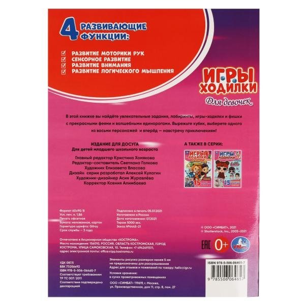 В этой книге девочка найдёт занимательные задания, увлекательные игры и фишки с очаровательными персонажами. Для игры необходимо вырезать кубик, сделать фишки, поставить их на игровое поле – и вперёд за приключениями! Активити имеет удобный формат, поэтому её можно взять с собой в дорогу.