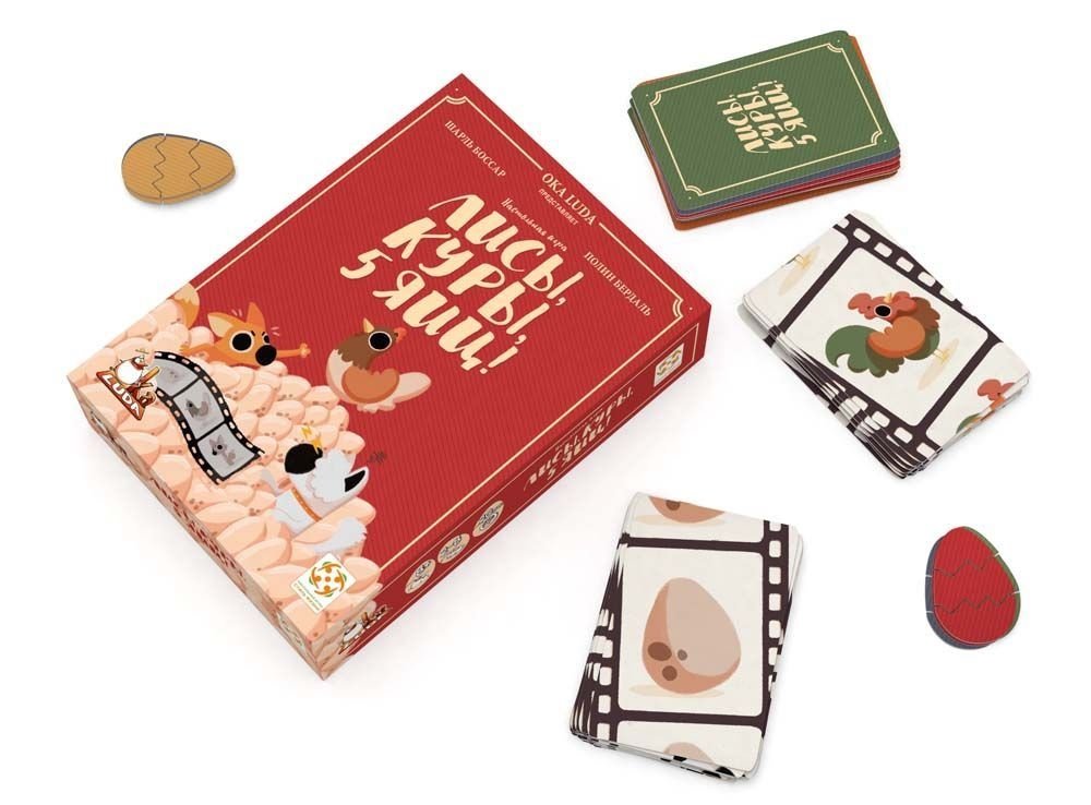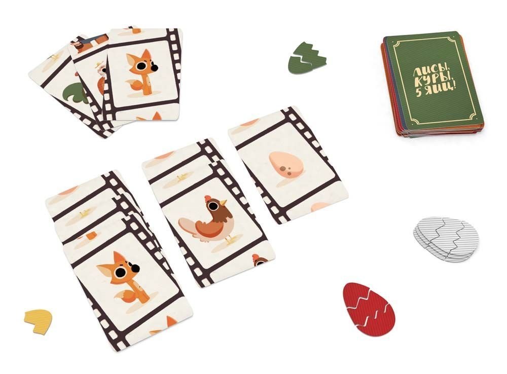 В быстрой и весёлой настольной игре "Лисы, куры, 5 яиц!" все за столом играют одновременно, рассматривая кадры киноленты, которая состоит из карт. Задачей игроков является внимательно следить за действиями героев на разыгрываемых картах и остановить съёмку, как только в кадре окажется пятое яйцо.
