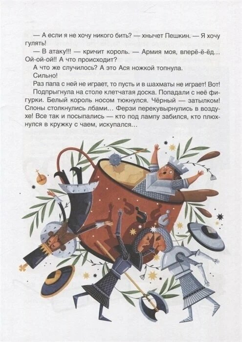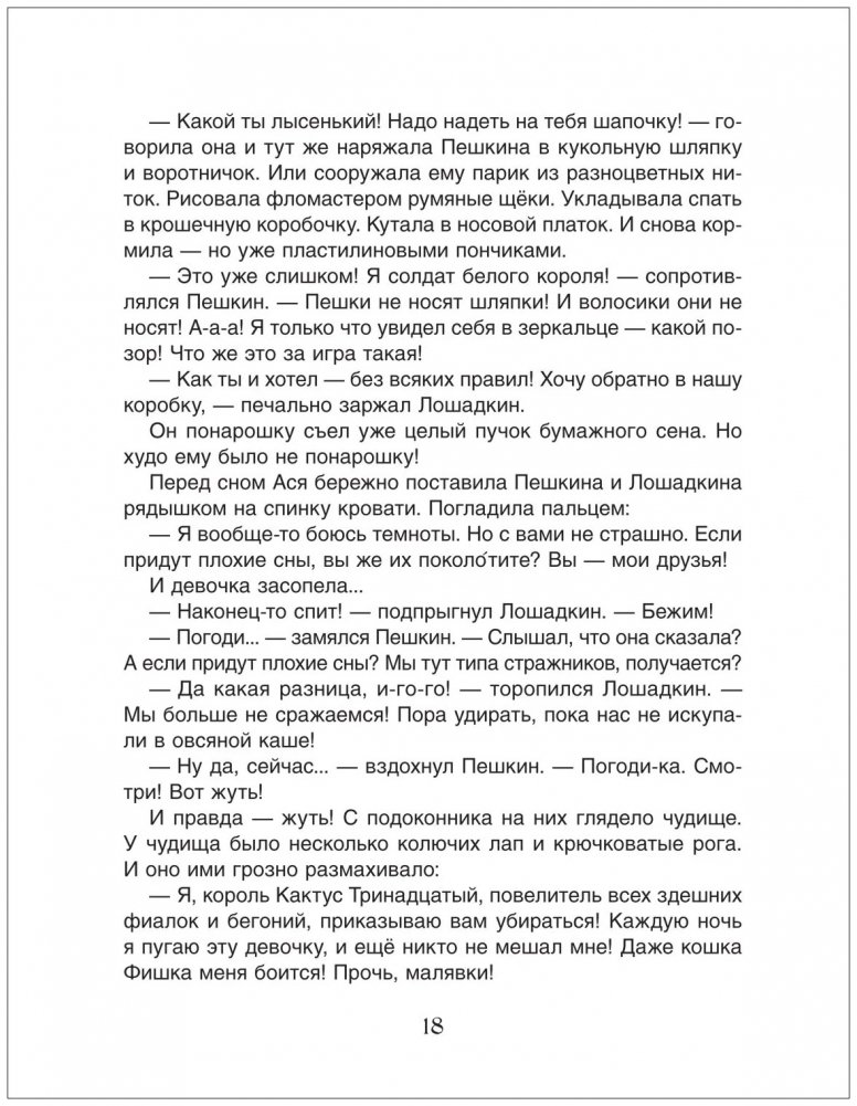 Папа вечно сидит за своими шахматами, а на Асю — ноль внимания. Как-то раз не выдержала Ася да как топнет ножкой! Вмиг посыпались фигурки с шахматной доски: кто под лампу закатился, кто плюхнулся в кружку с чаем… Стыдно стало Асе, собрала она все фигурки, вот только две так и не нашла — белого Пешкина и черного Лошадкина. Теперь двух потеряшек ждут удивительные приключения: бегство от кошки, плавание верхом на резиновой уточке и даже сражение с грозным королем Кактусом…В этой книжке вы найдете не только забавную сказку о похождениях двух фигурок, но и множество занимательных фактов о шахматах, а также словарик с важными терминами. А прочитав книжку до конца, вы сможете самостоятельно разыграть описанную в ней шахматную партию!Придумала эту сказку Валентина Дегтева — известный писатель и сценарист, педагог литературной мастерской, победитель конкурса «Новая детская книга» и лауреат многих премий, в их числе «Книга года» и «Золотое перо Руси».А картинки к ней нарисовала Дарья Красильникова — лауреат XII сезона конкурса «Новая детская книга» в номинации «Новая детская иллюстрация».