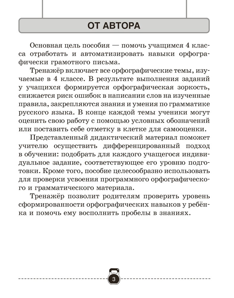 Пособие включает тренировочные задания, которые помогут развить орфографическую зоркость, снизить риск ошибочного написания слов на изученные правила, закрепить знания и умения, полученные на уроках русского языка.