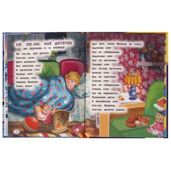 - добрые стихи и колыбельные: «Баю, баюшки, баю», «Серые коты», «Ой, лю-лю, моё дитятю», «Тихо дремлет малютка в кроватке своей» и др.