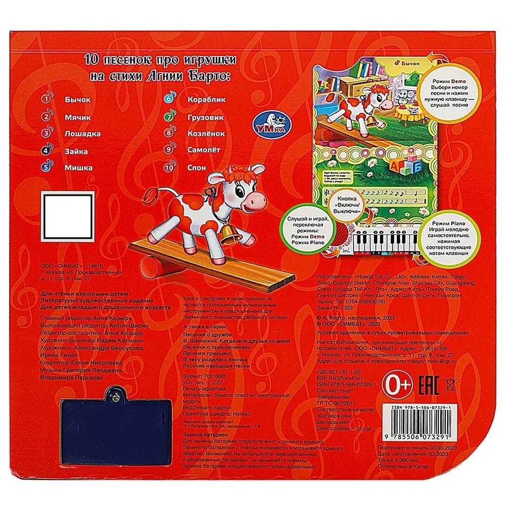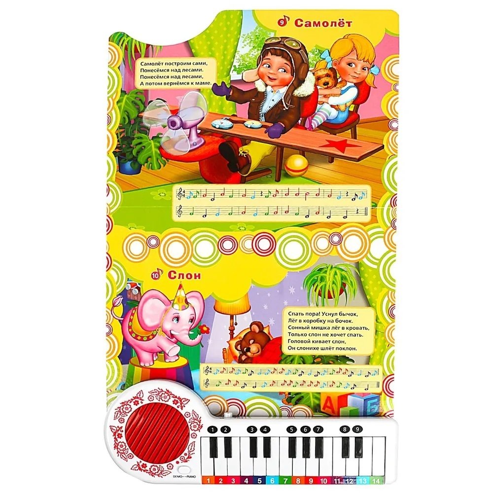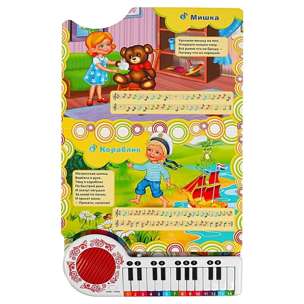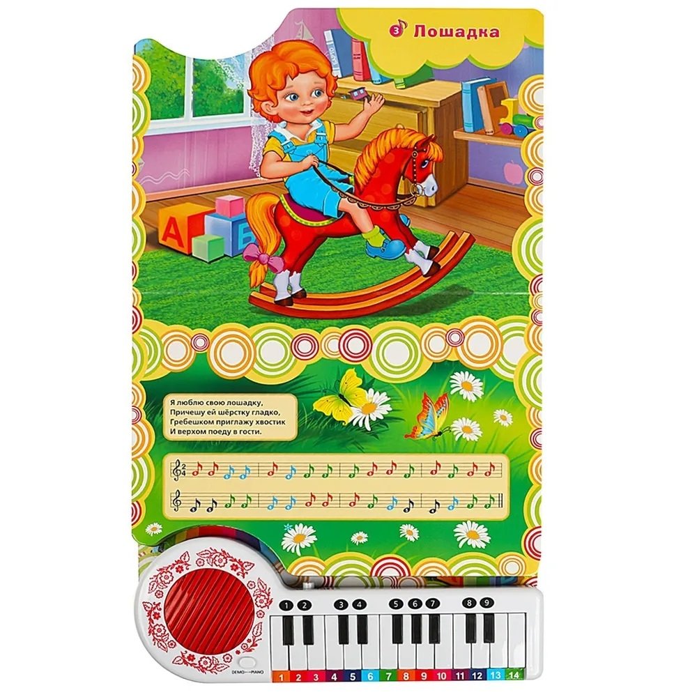 На каждой страничке это занимательной книги ребёнка ждут яркие иллюстрации, стихи известной детской поэтессы Агнии Барто и ноты к песенкам. При нажатии на кнопку слева от клавиш происходит переключение на режим проигрывания песен, при втором нажатии - переключение на пианино. В режиме пианино маленький музыкант, нажимая на клавиши, сможет наиграть по нотам-подсказкам песенки из книги или придумать свои собственные мелодии. Книга сделана из плотного картона, поэтому мамы могут не опасаться, что ребёнок порвёт странички.