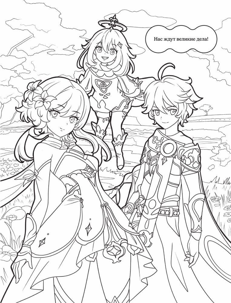 Отправляйся в удивительное путешествие по Инадзуме в компании с любимыми персонажами! Вечное спокойствие храма Наруками и загадочное волшебство Ватацуми, бескрайнее море и скалистые берега — все это и многое другое ждет тебя на страницах этой раскраски.