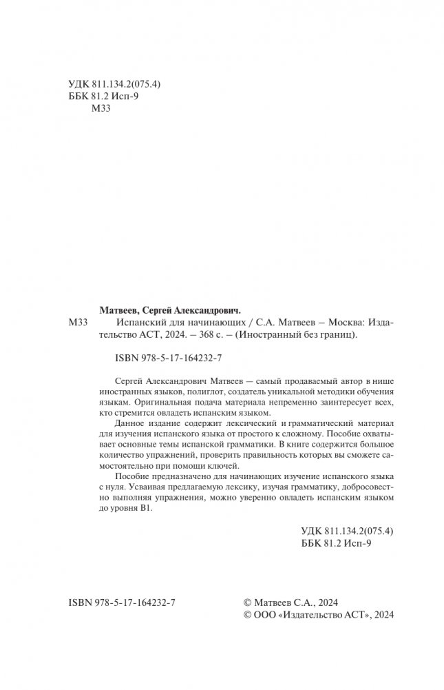 Сергей Александрович Матвеев — самый продаваемый автор в нише иностранных языков, полиглот, создатель уникальной методики обучения языкам. Оригинальная подача материала непременно заинтересует всех, кто стремится овладеть испанским языком.