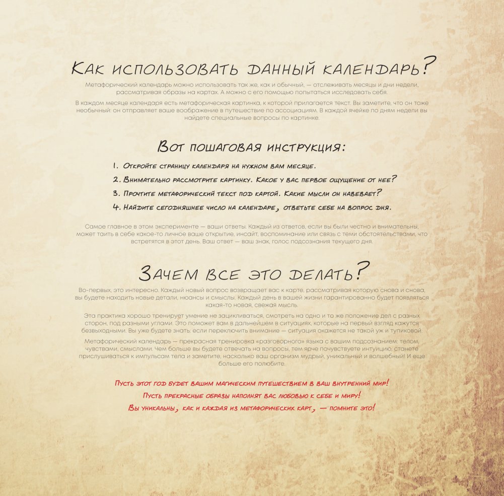 Волшебный календарь, наполненный символами и знаками для тех, кто любит получать подсказки из ярких образов и своего подсознания. В каждом месяце вы найдете необычную метафорическую иллюстрацию (карту) с текстом и вопросы на каждый день, которые помогут вам ежедневно находить новые послания во вселенной метафор. В календаре есть инструкция, которая расскажет о магии метафорических карт и о том, как с ними взаимодействовать.