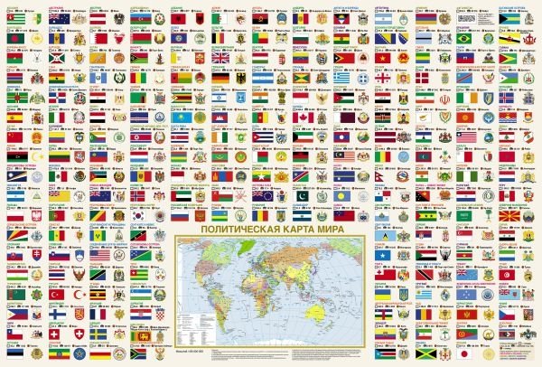 Двусторонний настенный плакат размером 1170х790 мм. На стороне с политической картой мира отображены флаги и гербы 196 независимых государств. На стороне с политико-административной картой России представлены флаги и гербы всех субъектов Федерации. Данный плакат станет полезным информационным акцентом в интерьере или украсит класс географии, что позволит школьникам обращать внимание на гербы и флаги, а следовательно, лучше запоминать информацию.