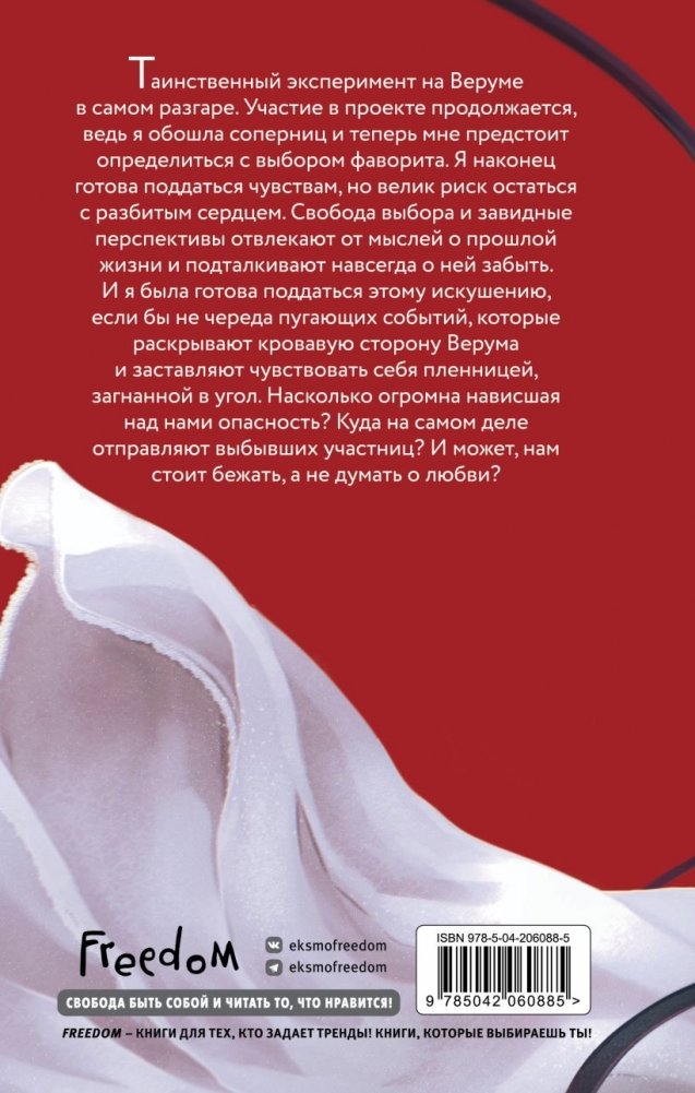 Таинственный эксперимент на Веруме в самом разгаре. Участие в проекте продолжается, ведь я обошла соперниц и теперь мне предстоит определиться с выбором фаворита. Я наконец готова поддаться чувствам, но велик риск остаться с разбитым сердцем. Свобода выбора и завидные перспективы отвлекают от мыслей о прошлой жизни и подталкивают навсегда о ней забыть. И я была готова поддаться этому искушению, если бы не череда пугающих событий, которые раскрывают кровавую сторону Верума и заставляют чувствовать себя пленницей, загнанной в угол. Насколько огромна нависшая над нами опасность? Куда на самом деле отправляют выбывших участниц? И может нам стоит бежать, а не думать о любви?