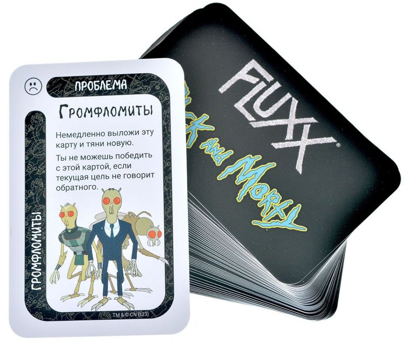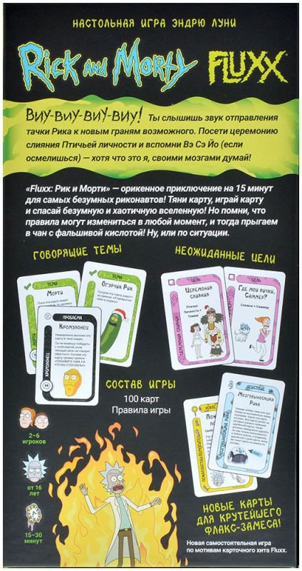 "Fluxx: Рик и Морти" – это карточное безумное приключение на 20 минут: раздали карты – сыграли карты, всё! Но, что и как разыграть, будут диктовать постоянно меняющиеся правила этой хаотичной вселенной. И не вздумайте им сопротивляться! Лучше сами возглавьте этот беспорядок и действуйте по ситуации. Но если что, прыгайте в чан с фальшивой кислотой!