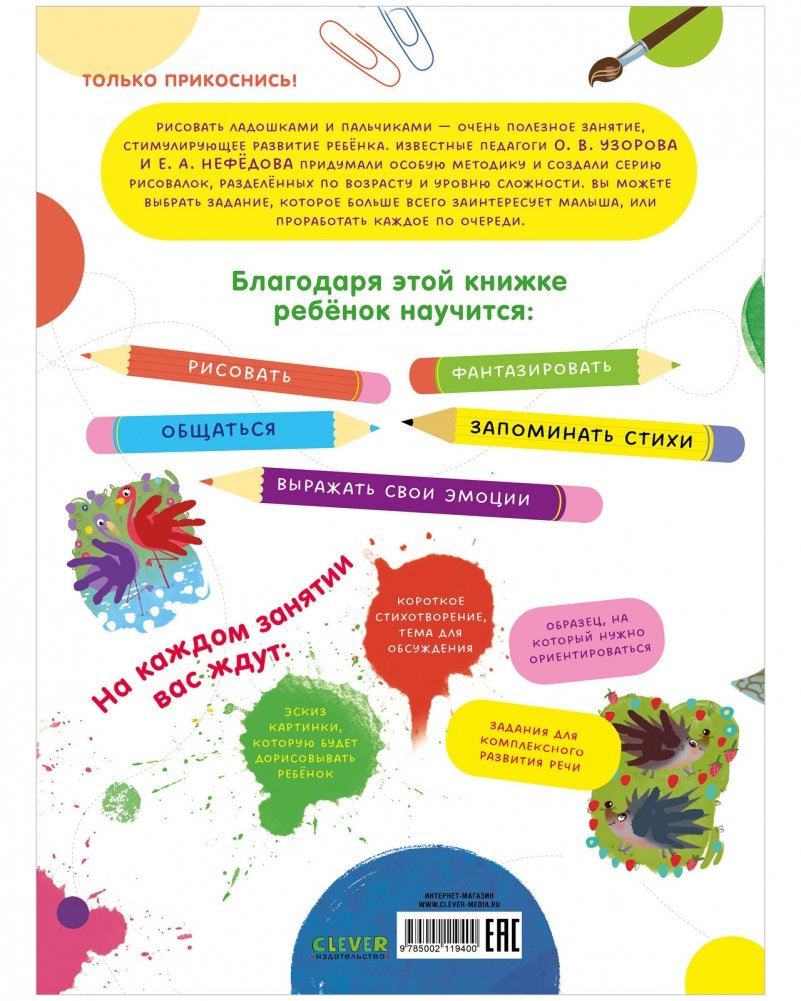 Рисовать ладошками и пальчиками — очень полезное занятие, стимулирующее развитие ребенка. Известные педагоги О. В. Узорова и Е. А. Нефедова придумали особую методику и создали серию рисовалок. Вы можете выбрать задание, которое больше всего заинтересует малыша, или проработать каждое по очереди.