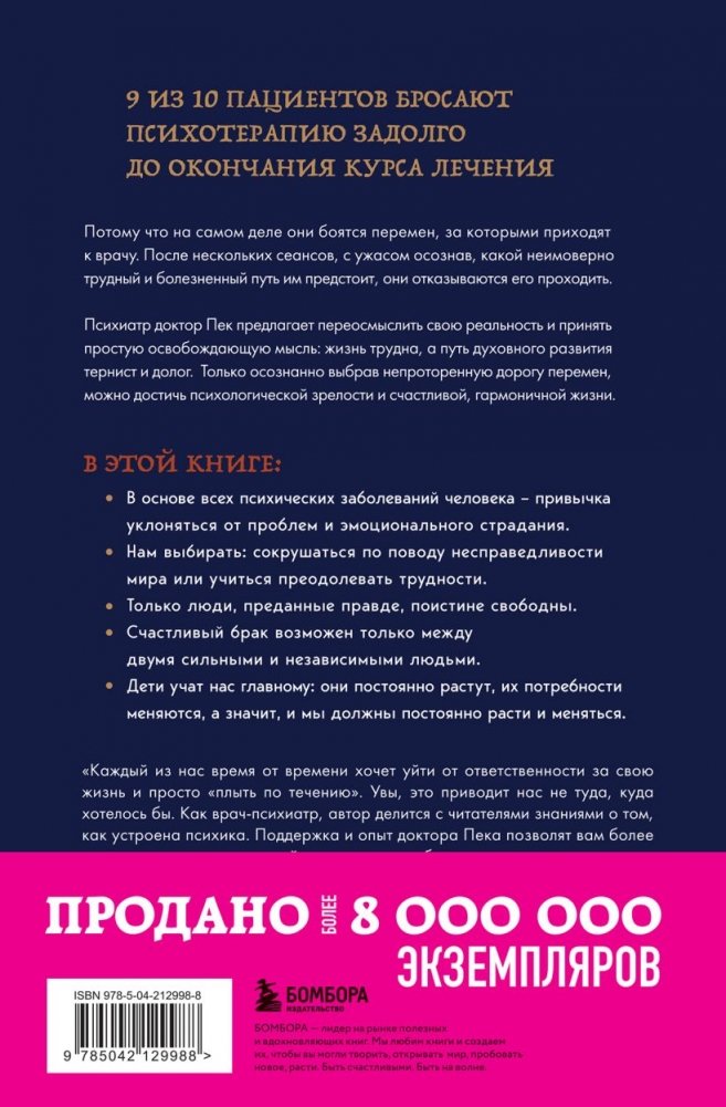 Столкновение с проблемами и их решение – болезненный процесс, которого большинство из нас пытается избежать. Люди ленивы и склонны сторониться перемен, что приводит к еще большей боли и блокировке личностного роста. Опираясь на обширный профессиональный опыт, психиатр доктор Пек показывает, что преодоление трудностей и страдание от изменений – единственный способ достичь более высокого уровня самопознания. В этой книге вы узнаете, как отличить любовь от зависимости, как стать более чутким родителем, смело встретиться со своим собственным "я" и с благодарностью принять не всегда приятную реальность. "Непроторенная тропа" поможет мягко пройти через трудный процесс перемен на пути к психологической зрелости и более счастливой и осознанной жизни.