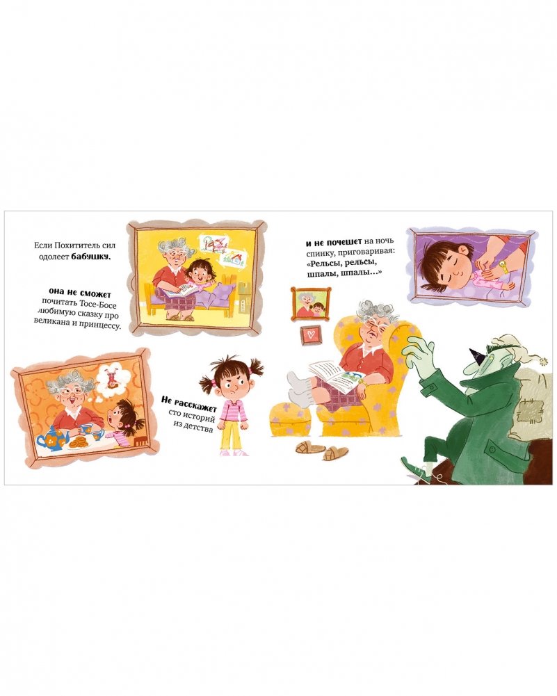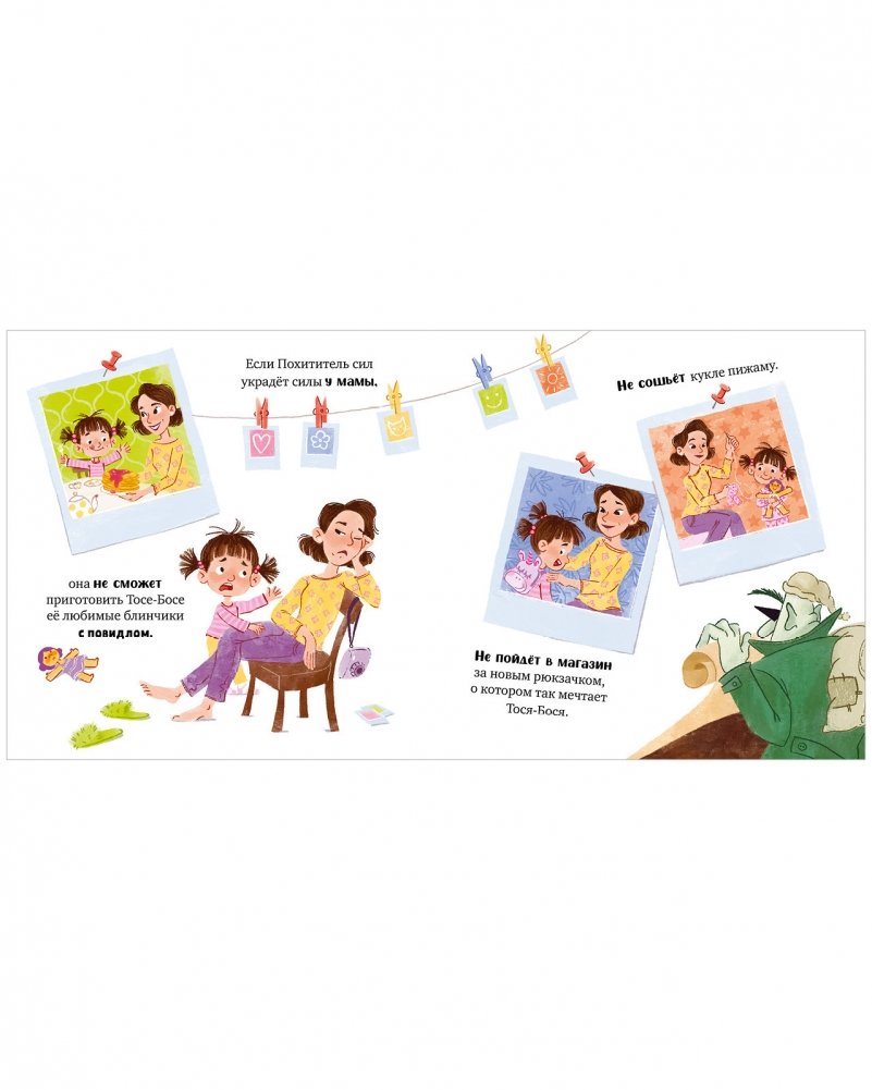 Тося-Бося может часами играть, бегать, летать с горки. Ее энергия неиссякаема… Но стоит Тосе-Босе подумать о мытье рук и чистке зубов, как ее силы вдруг пропадают. Кажется, во всем виноват коварный Похититель сил! Что, если он доберется до мамы и она не сможет печь блинчики из-за упадка сил? Или до папы? До бабушки? Тося-Бося полна решимости победить негодяя.