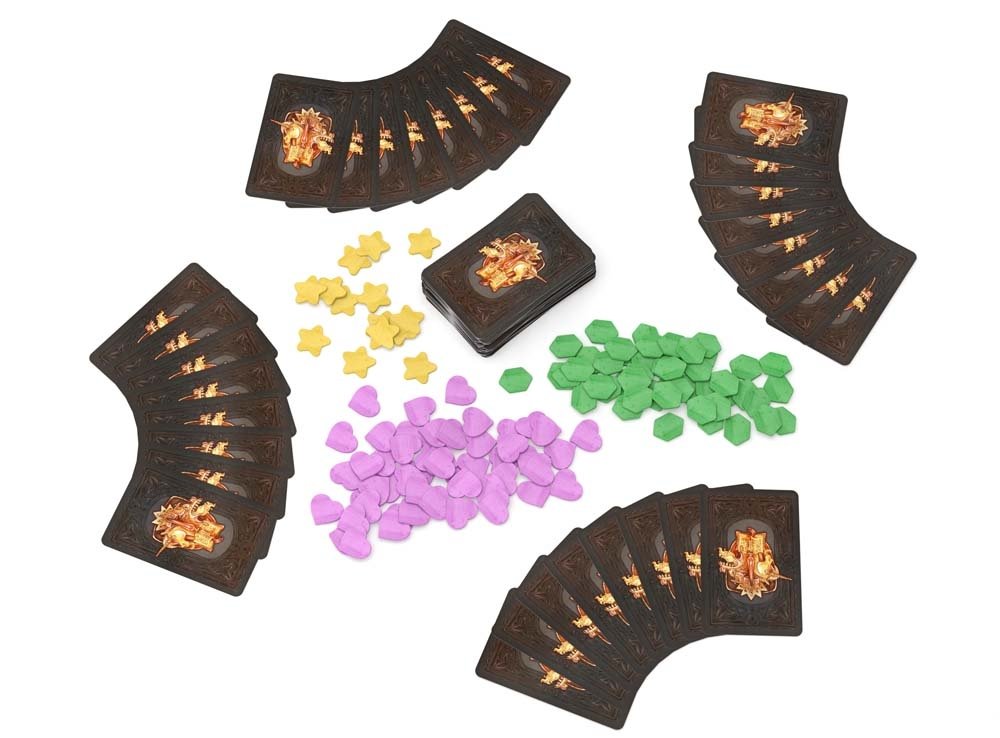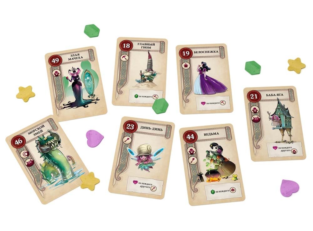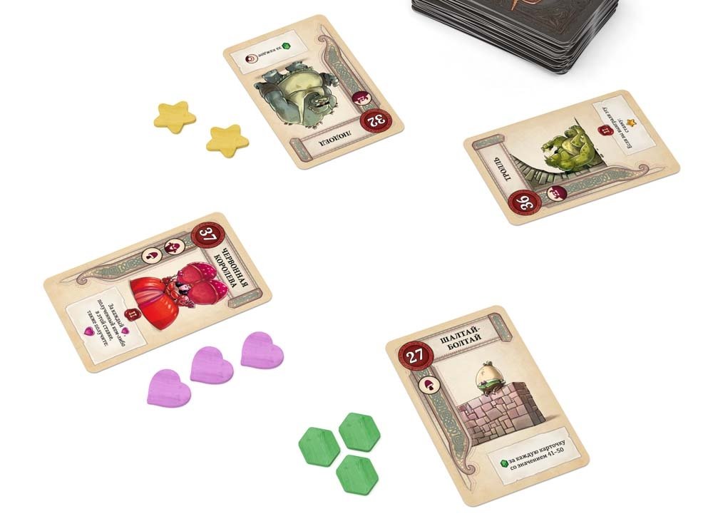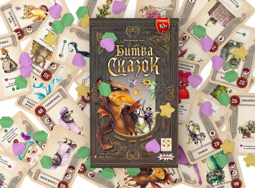 В состав настольной игры Битва сказок входят: 50 карточек, 115 жетонов победных очков, правила игры.