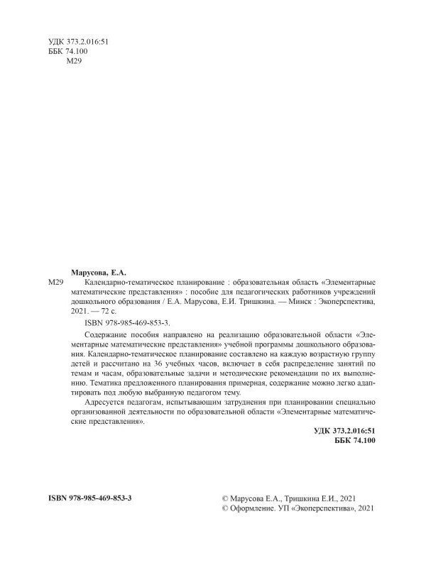 Содержание пособия направлено на реализацию образовательной области "Элементарные математические представления" учебной программы дошкольного образования. Календарно-тематическое планирование составлено на каждую возрастную группу детей и рассчитано на 36 учебных часов, включает в себя распределение занятий по темам и часам, образовательные задачи и методические рекомендации по их выполнению. Тематика предложенного планирования примерная, содержание можно легко адаптировать под любую выбранную педагого тему.