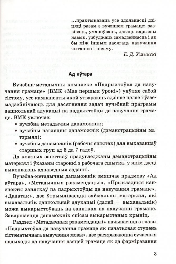 Вучэбна-метадычны дапаможнік "Падрыхтоўка да навучання грамаце" з'яўляецца часткай вучэбна-метадычнага комплексу, у ім раскрываюцца асновы навучання дзяцей дашкольнонага ўзросту грамаце ў адпаведнасці з вучэбнай праграмай дашкольнай адукацыі. Прыводзяцца прыкладныя канспекты для выхаванцаў ад 5 да 7 гадоў.