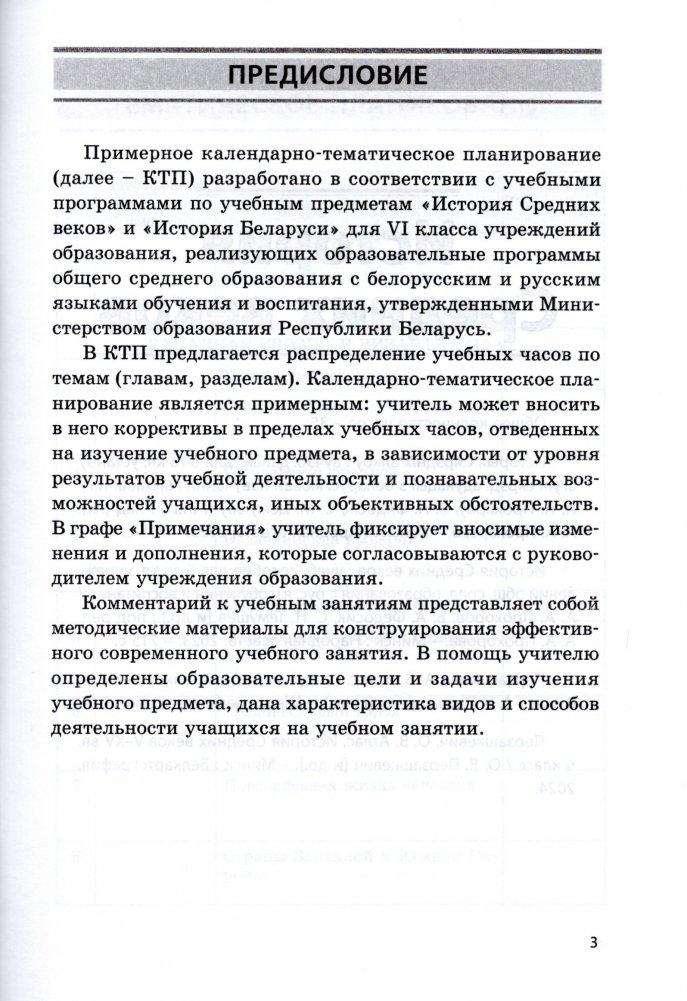 Примерное календарно-тематическое планирование разработано в соответствии с учебными программами по учебным предметам "История Средних веков" и "История Беларуси" для VI класса учреждений образования, реализующих образовательные программы общего среднего образования с белорусским и русским языками обучения и воспитания, утвержденными Министерством образования Республики Беларусь.