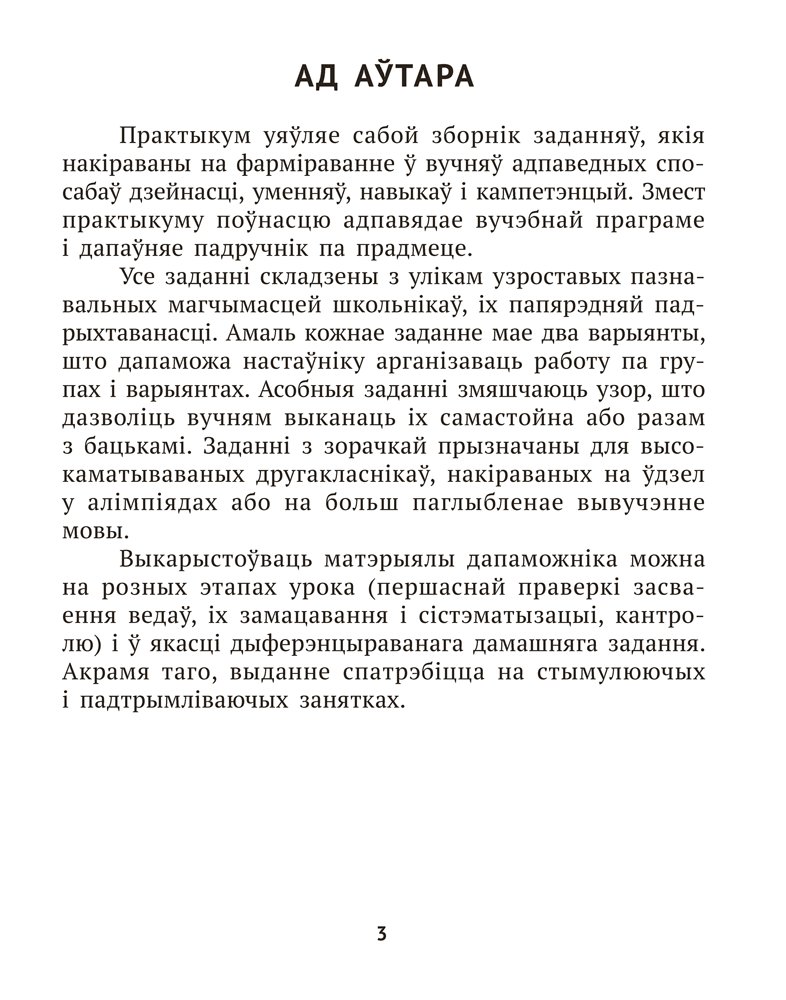 Выданне прызначана для замацавання ведаў, фарміравання ў вучняў спосабаў дзейнасці, уменняў, навыкаў і кампетэнцый, прадугледжаных вучэбнай праграмай. Змест практыкуму дапаўняе вучэбны дапаможнік і ўключае разнастайныя заданні, якія ўлічваюць узроставыя асаблівасці школьнікаў і іх узровень падрыхтоўкі. Матэрыял можна выкарыстоўваць на розных этапах урока, пры арганізацыі самастойнай працы, а таксама на стымулюючых і падтрымліваючых занятках.