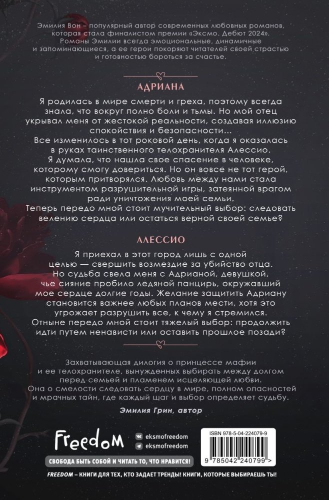 Я родилась в мире смерти и греха, поэтому всегда знала, что вокруг полно боли и тьмы. Но мой отец укрывал меня от жестокой реальности, создавая иллюзию спокойствия и безопасности… Все изменилось в тот роковой день, когда я оказалась в руках таинственного телохранителя Алессио. Я думала, что нашла свое спасение в человеке, которому смогу довериться. Но он вовсе не тот герой, которым притворялся. Любовь между нами стала инструментом разрушительной игры, затеянной врагом ради уничтожения моей семьи.