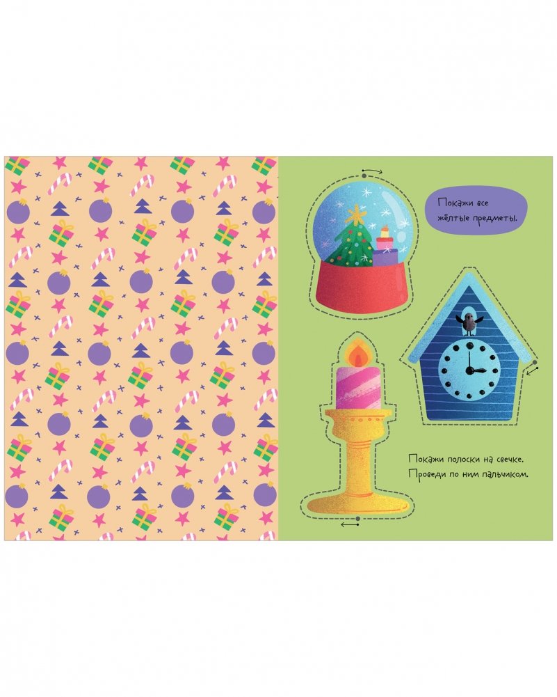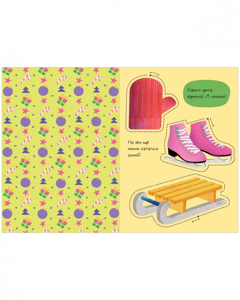 Эта книга для малышей понравится родителям, которые ищут развивашки 2 года и книги для детей 3 лет. Здесь есть не только вырезалки, но и простые задания и вопросы на сообразительность. Например, нужно найти все желтые предметы на странице, вспомнить, на чем катаются зимой, и рассказать, какого цвета шапка у снеговика. Такие детские книги — прекрасный подарок на новый год ребенку и подарок ребенку 2 года.