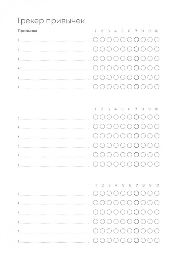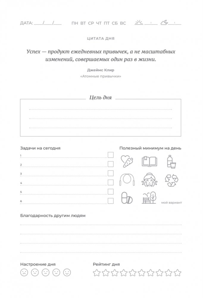 Как избавиться от плохих привычек и приобрести полезные? Начните с малого, чтобы добиться большего. А наш ежедневник поможет вам в этом. Основной блок, разлинованный по дням и рассчитанный на три месяца, включает в себя постановку целей и выработку привычек для их достижения. Мотивирующая цитата зарядит настроением на весь день. Утреннее планирование поможет не забыть выполнить все необходимые задачи; удобные иконки напомнят о мелочах для хорошего самочувствия, а вечерний обзор прошедшего дня поможет оценить личную результативность. Для тех, кто хочет жить осознанно, добиваться своих целей и вести здоровый образ жизни. Для фанатов всемирного бестселлера «Атомные привычки» Джеймса Клира, а также для тех, кто хочет оптимизировать и улучшить свою жизнь, мы создали этот ежедневник. Удобный формат. Три приятные soft touch-обложки на выбор.