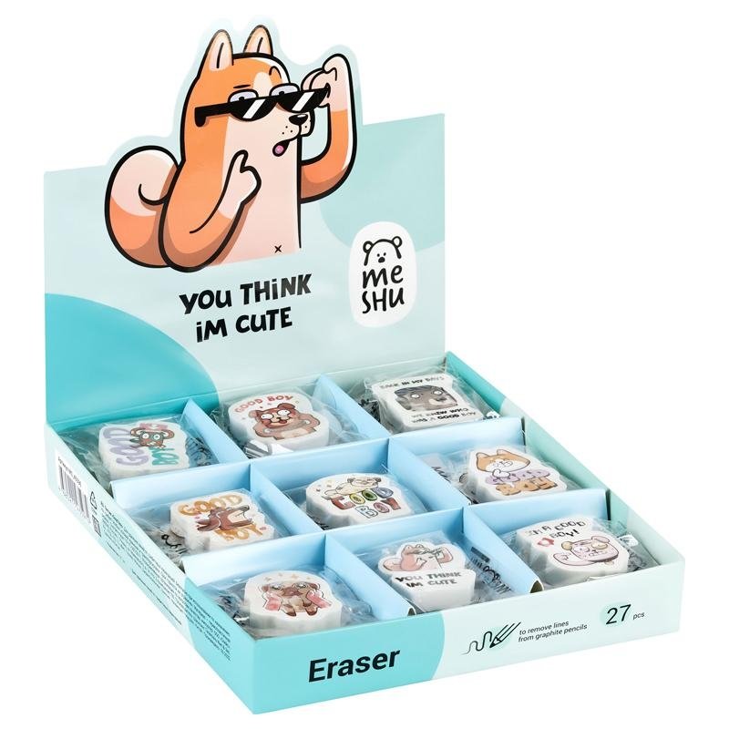 Ластик MESHU Good boy – яркий и забавный помощник в школе, офисе и дома. Ластики фигурной формы выполнены из высококачественной термопластичной резины. Представлено ассорти из 9 веселых дизайнов ластика белого цвета с рисунком забавных песиков. Размер – 40x30x13 мм. Отлично стирает чернографитный карандаш. Ластики представлены в дисплей-боксе, каждый упакован в отдельный пакет.