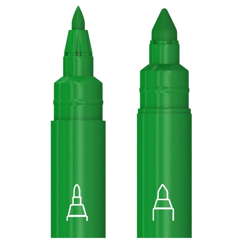 Конический наконечник размером 4,7 мм позволяет рисовать как тонкие линии шириной от 1 мм, так и более толстые до 4 мм. Пулевидный наконечник толщиной 2,3 мм удобен для быстрого раскрашивания как крупных, так и более детальных элементов рисунка. Оба пишущих узла фиксированные и не продавливаются внутрь, даже при случайном сильном нажатии. Корпус круглой формы изготовлен из полипропилена. Форма зоны захвата – круглая. Тип чернил – смываемые. Фломастеры упакованы в картонную коробку с европодвесом.