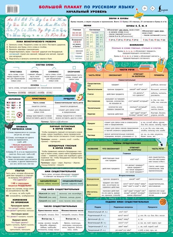 Ребёнок постоянно забывает правила русского языка? Хотите привить ребёнку интерес к изучению русского? Большой красочный плакат (формат 43,5×60 см) по русскому языку — это компактная и визуально понятная шпаргалка для начального уровня. Здесь собрано всё, что действительно нужно в первые годы обучения: алфавит, звуки, буквы, части слова, правила переноса слов, части речи, члены предложения и многое другое. Вся информация структурирована в наглядные таблицы и легко воспринимается. Плакат создан для младших школьников.
