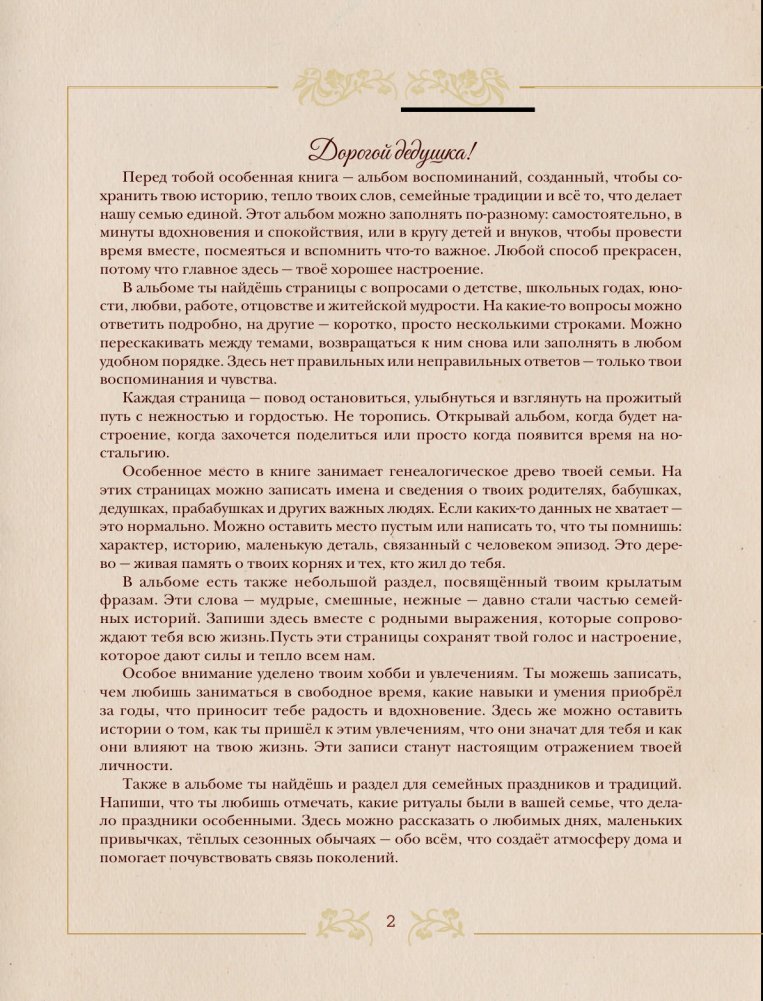 Этот семейный альбом создан специально для тебя — с любовью, уважением и благодарностью. Он поможет сохранить самые тёплые воспоминания, важные моменты жизни и мудрые мысли, которыми ты готов поделиться с нами.
