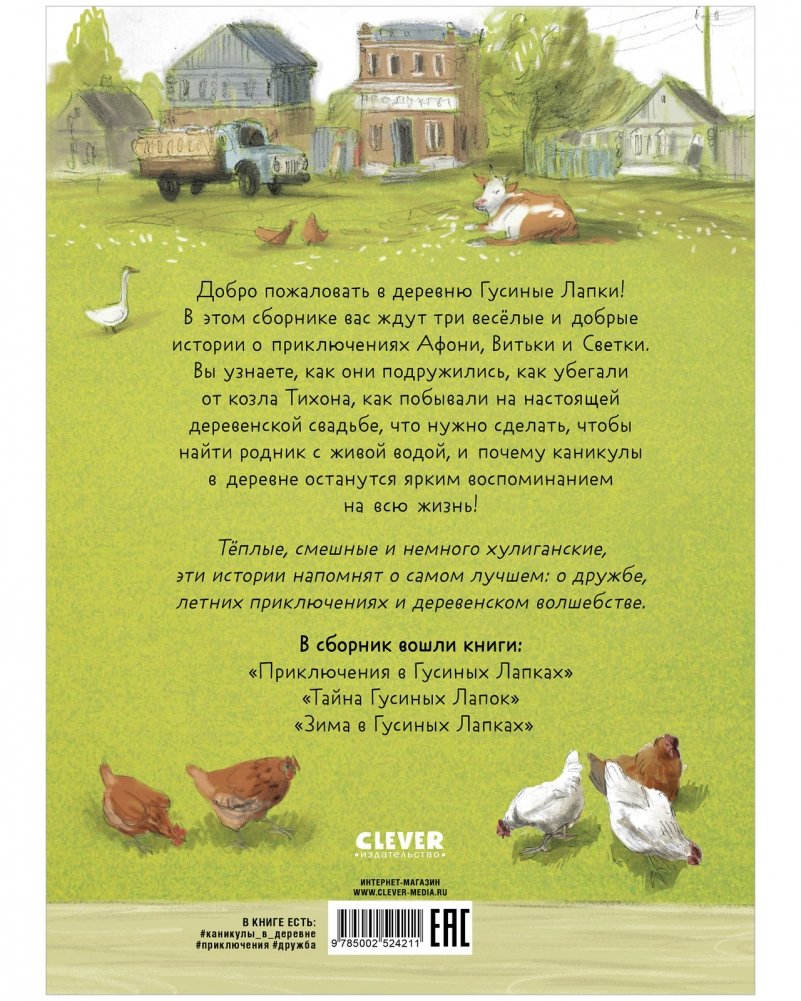 «Деревня Гусиные Лапки. Три истории в одной книге» — это теплые, смешные и немного хулиганские повести, которые напомнят детям и родителям о самом лучшем: дружбе, летних приключениях и деревенском волшебстве. А потрясающие иллюстрации этой Clever книги, выполненные Светой Овиновой, сделают героев и истории еще более живыми и реалистичными. В сборник вошли книги: «Приключения в Гусиных Лапках», «Тайна Гусиных Лапок» и «Зима в Гусиных Лапках».
