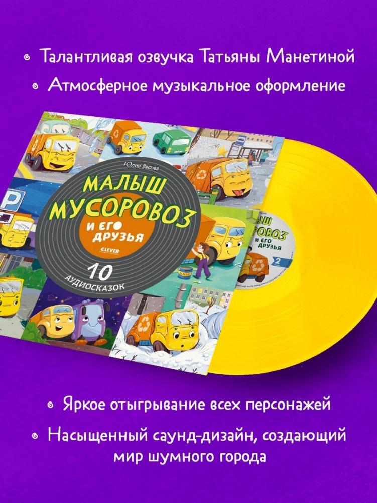 Если вы ищете виниловые пластинки для детей, сказки для детей про малыша мусоровоза, пластинки музыкальные по книгам издательства Clever, сказки для малышей Юлии Весовой, пластинка виниловая «Малыш мусоровоз и его друзья. 10 аудиосказок» для вас. Эта винил-пластинка прекрасно подойдет в качестве сказки для детей 2 лет и сказки для детей 3 лет.