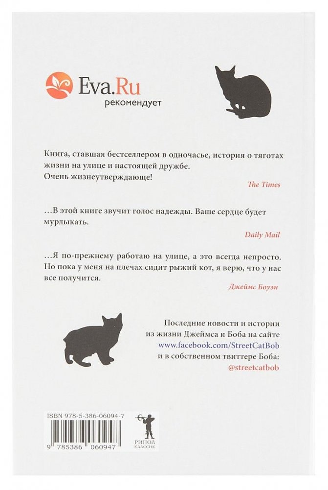 В этой истории два главных героя - Джеймс Боуэн, уличный лондонский музыкант, и рыжий Боб, уличный лондонский кот. Они были бездомными и одинокими, но однажды повстречали друг друга... Джеймс погибал от наркотиков и отчаяния, в его жизни не было никакого смысла, пока в ней не появился четвероногий друг, который помог ему справиться с проблемами, принес удачу и стал настоящим ангелом-хранителем. Теперь Боба и Джеймса (именно в такой последовательности!) прекрасно знают не только жители Лондона, которые встречают их на улицах, в метро и кафе, но и сотни тысяч людей во всем мире. Ролики на Youtube, фотографии на фейсбуке, записи в твиттер, а теперь и книга, написанная Джеймсом Боуэном, рассказывают удивительную историю о дружбе с котом, который изменил его жизнь.