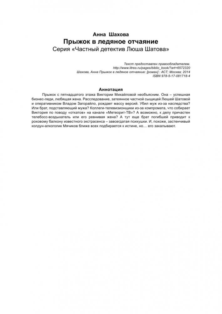 Прыжок с пятнадцатого этажа Виктории Михайловой необъясним. Она – успешная бизнес-леди, любящая жена. Расследование, затеянное частной сыщицей Люшей Шатовой и оперативником Владом Загорайло, рождает массу версий. Убил муж из-за наследства? Или брат, подставляющий мужа? Коллеги-телевизионщики из-за компромата, что собирает Виктория по поводу «откатов» на канале «Метеорит ТВ»? А возможно, к делу причастен телебосс-воздыхатель или его ревнивая жена? А тут еще брат погибшей приводит к роковому балкону известного экстрасенса – завсегдатая психушки. И, похоже, застенчивый колдун-алкоголик Мячиков ближе всех подбирается к истине, но… его закалывают.