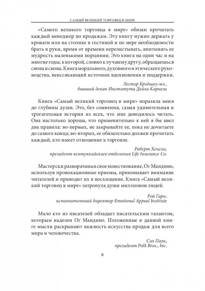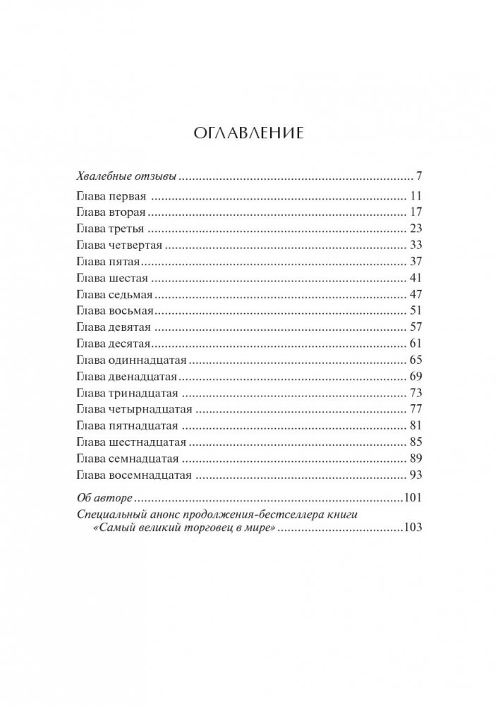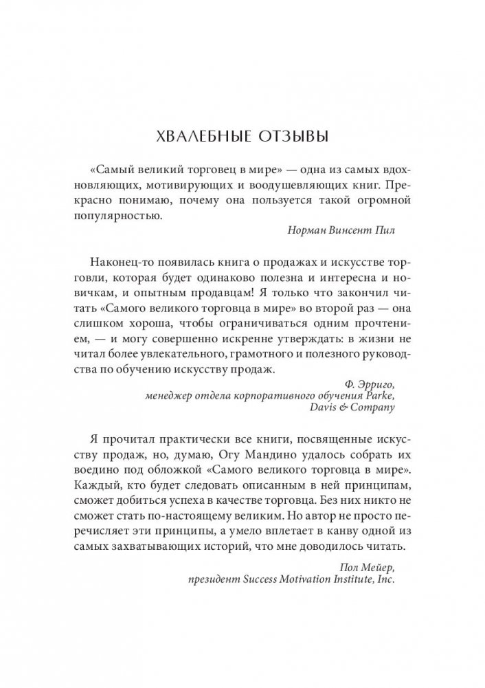 Перед вами одна из самых вдохновляющих, мотивирующих и воодушевляющих книг всех времен. Она представляет собой великолепное руководство по продажам, которое будет одинаково полезно и интересно как новичкам, так и бывалым торговцам! Ог Мандино — незаурядная личность, талантливый продавец, один из самых читаемых авторов во всем мире — уже помог миллионам читателей поверить в собственные силы, научил преодолевать трудности, добиваться успеха и достигать благосостояния. Читайте и развивайтесь!